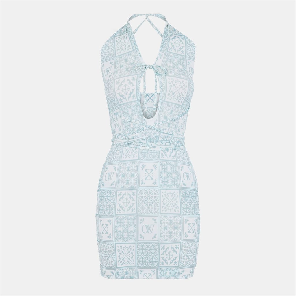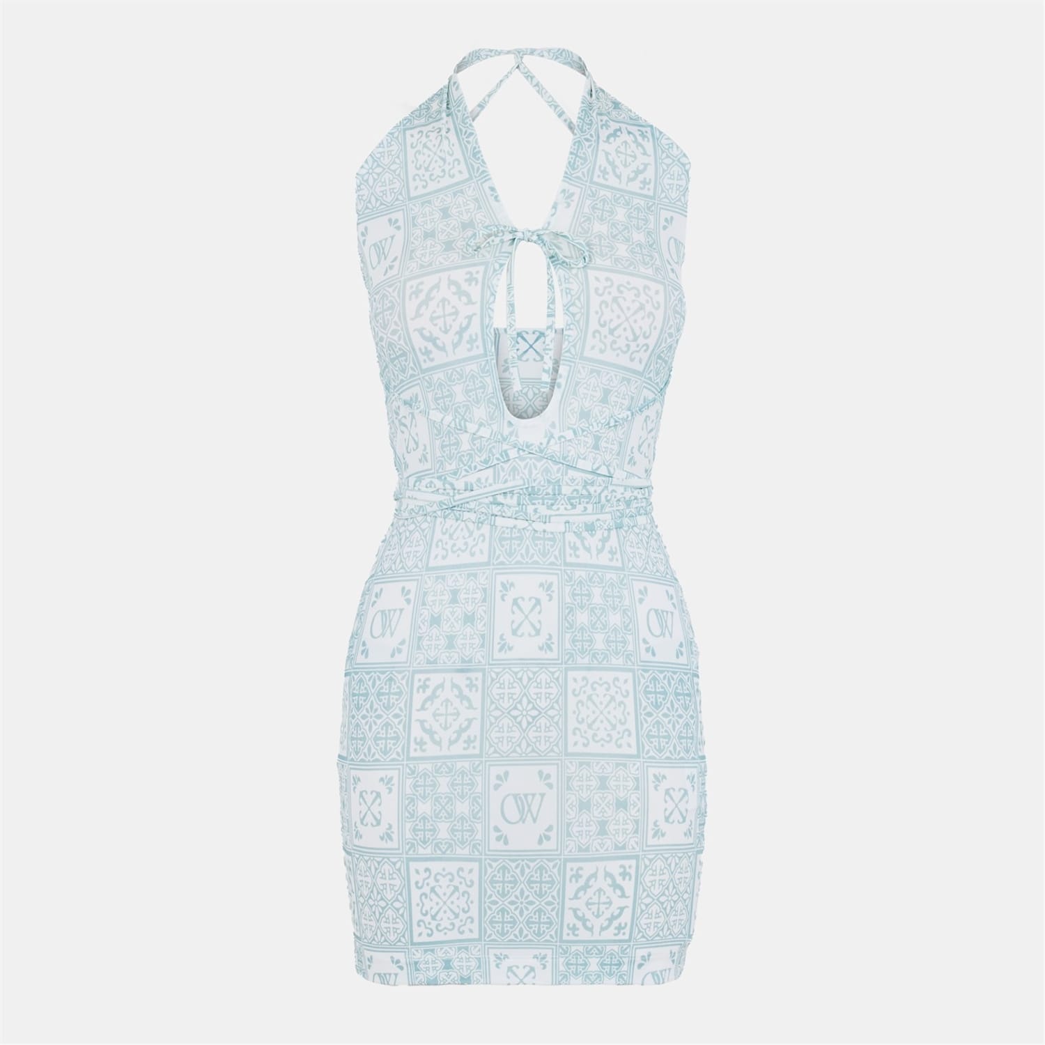 This Off White mini slip dress features a halter neck and a straight hem, offering a sleek and modern look. The slim fit accentuates the silhouette, while the geometric pattern adds a contemporary touch. A tie closure ensures a secure fit, and the logo embellishment provides a subtle brand signature. -