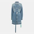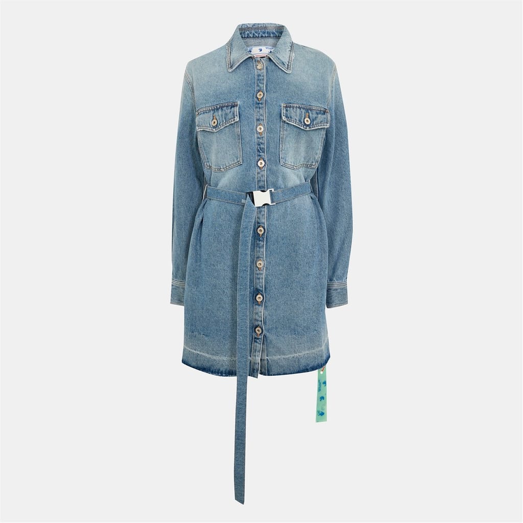This Off White mini shirtdress combines a solid pattern with a classic shirt collar and collared neck. Crafted from knit material, it features long sleeves and a straight hem. The dress is adorned with a logo and pocket embellishments, adding a touch of detail. A button closure completes the look, making it a versatile addition to any wardrobe. -