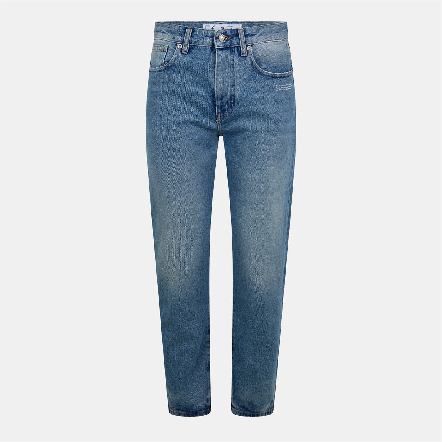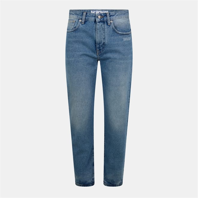 Discover the Off White jeans, featuring a straight fit and a classic five-pocket design. These jeans are equipped with a button and zip fly closure for a secure fit. The casual collection piece is adorned with a subtle logo embellishment, adding a touch of brand identity to your wardrobe. -