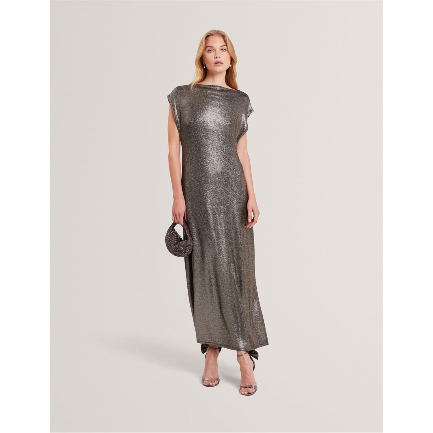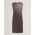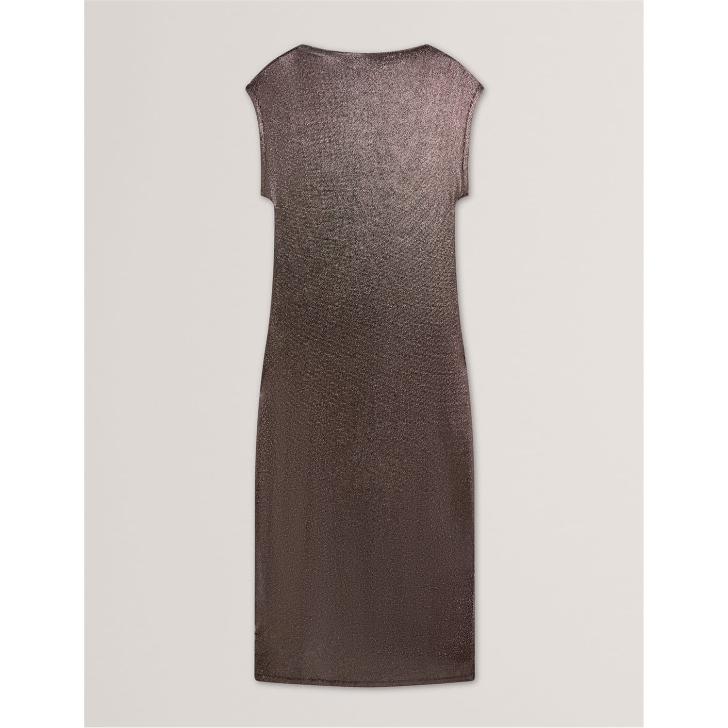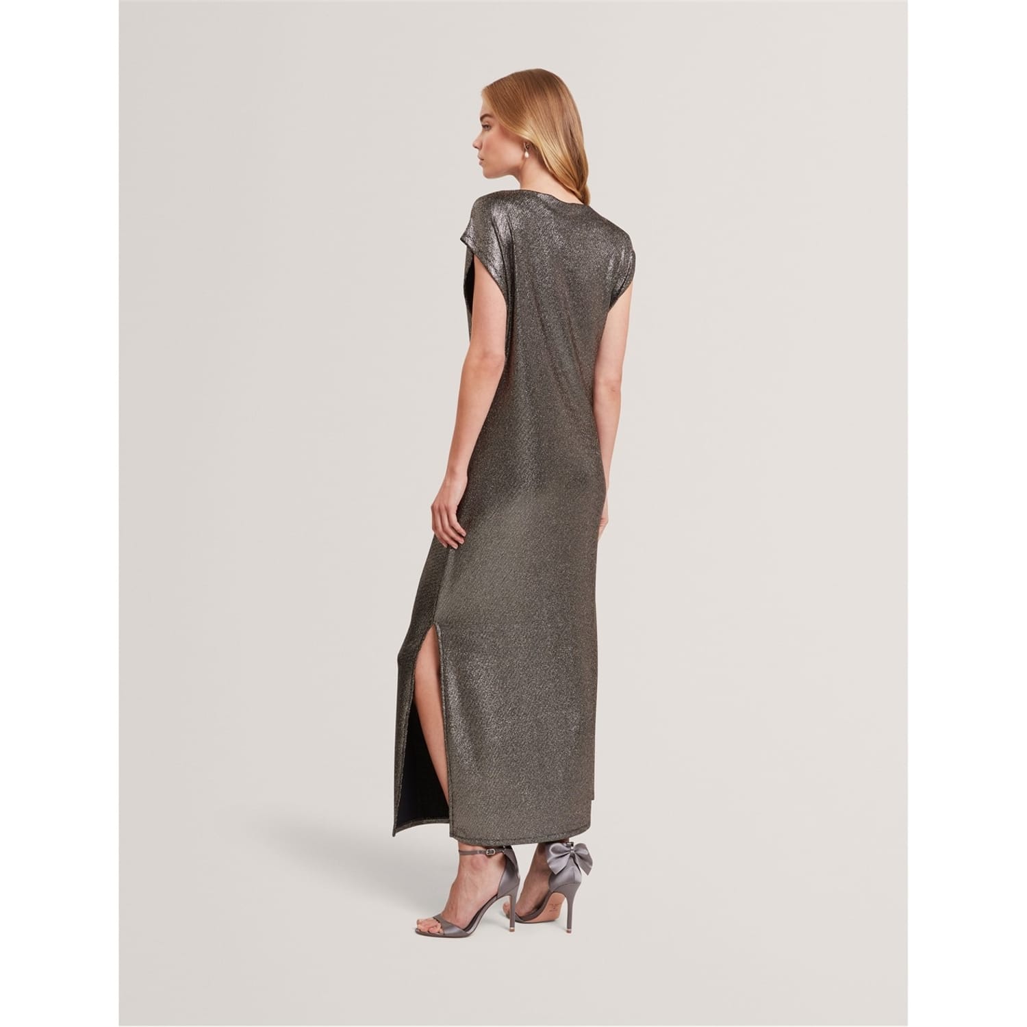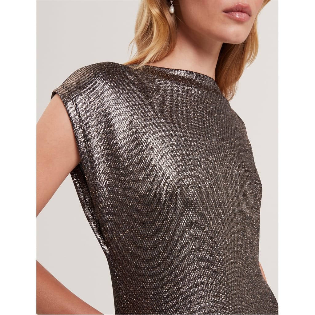 This Ted Baker sheath dress is a stunning maxi piece featuring a boat neck and an open hem. The metallic pattern adds a touch of elegance, while the regular fit ensures comfort. Perfect for any occasion, this dress combines style and sophistication effortlessly. -