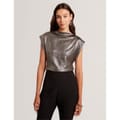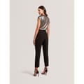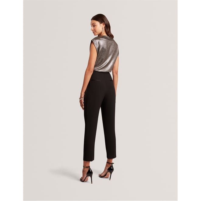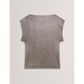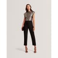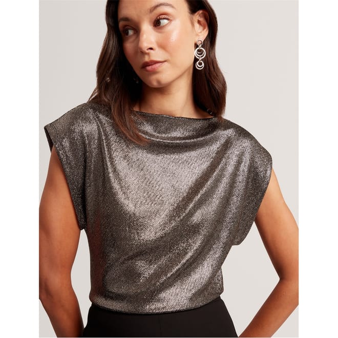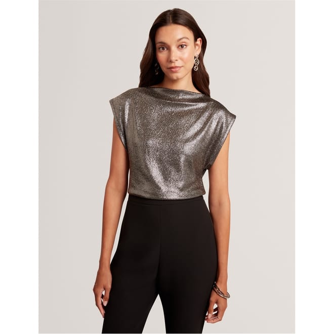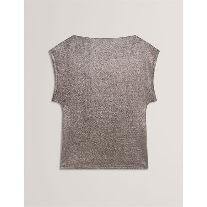 This Ted Baker top features a slim fit with a boat neck and cap sleeves. The metallic pattern is enhanced by intricate metallic stitching, adding a touch of elegance to the design. Perfect for those seeking a stylish and contemporary look. -