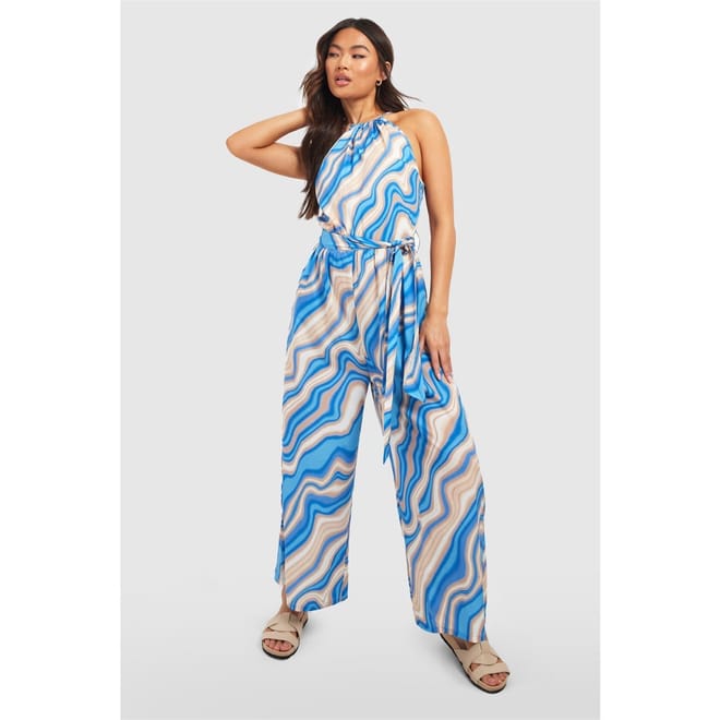 Discover the Influence wrap jumpsuit, featuring a halter neckline and sleeveless design. This relaxed fit piece is adorned with a wave pattern and practical pockets. The tie waist closure adds a touch of elegance, making it a perfect choice for casual occasions. -