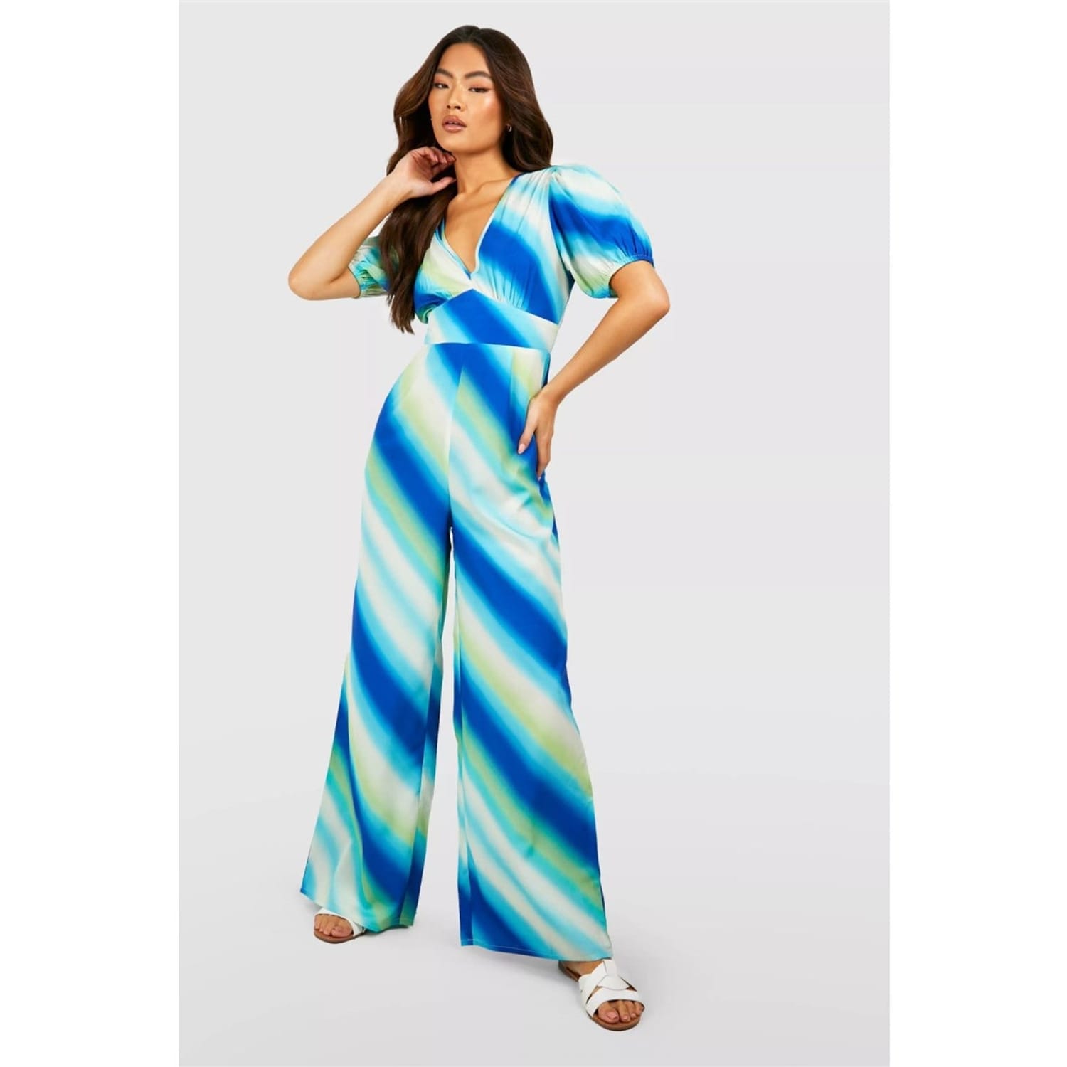 Discover the Influence jumpsuit, a perfect blend of cosy and casual collections. This piece features a gradient pattern and a V-Neck, complemented by short puff sleeves. Designed with a relaxed fit, it includes practical pockets for added convenience. -