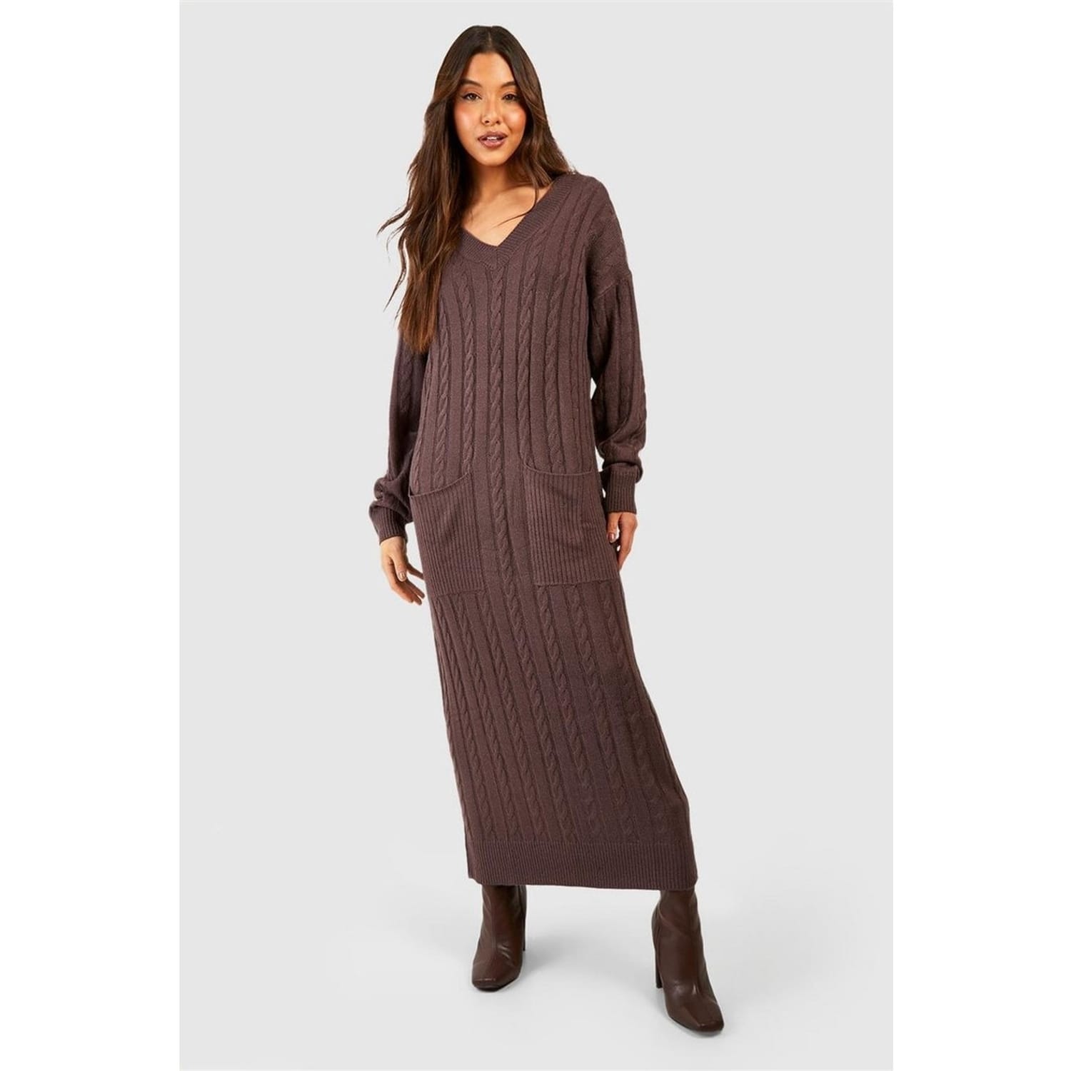 Violet Romance presents a maxi sweater dress featuring a v-neck and a straight hem. This knit piece showcases a cable knit pattern and includes practical pockets. Ideal for those seeking a blend of style and comfort. -