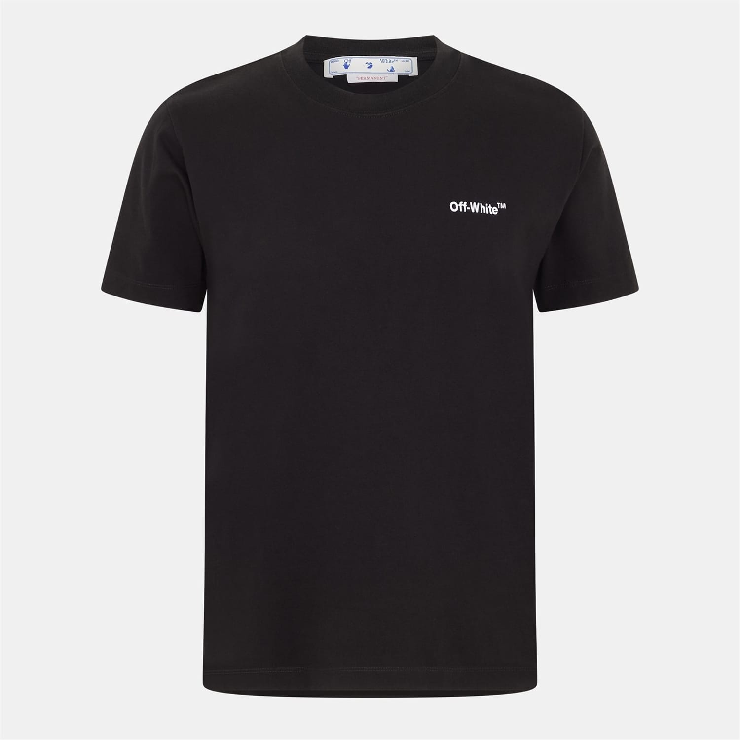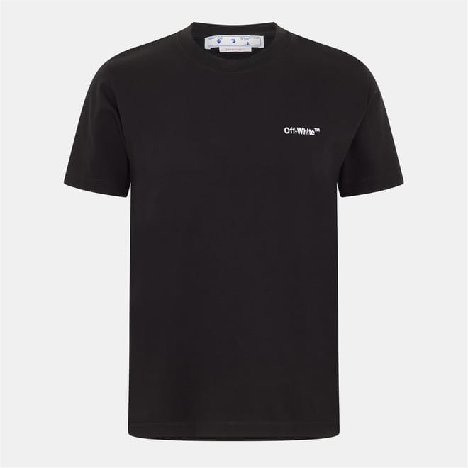 This Off White top is a casual staple featuring a crew neck and short sleeves. The solid pattern is complemented by a distinctive logo embellishment and lettering graphic, offering a modern touch. Designed with a slim fit, it is perfect for those who appreciate understated style with a hint of brand identity. -