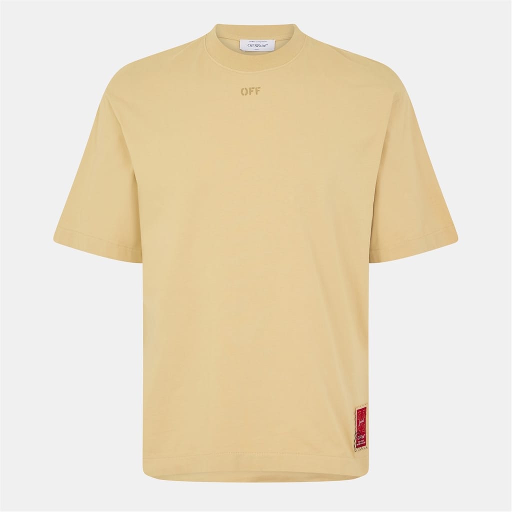 This Off White top features a regular fit with a crew neck and short sleeves. The solid pattern is complemented by distinctive logo embellishments and lettering graphics, making it a standout piece in any casual collection. -