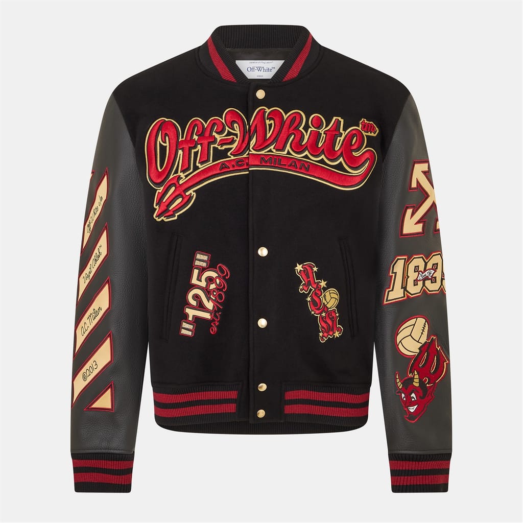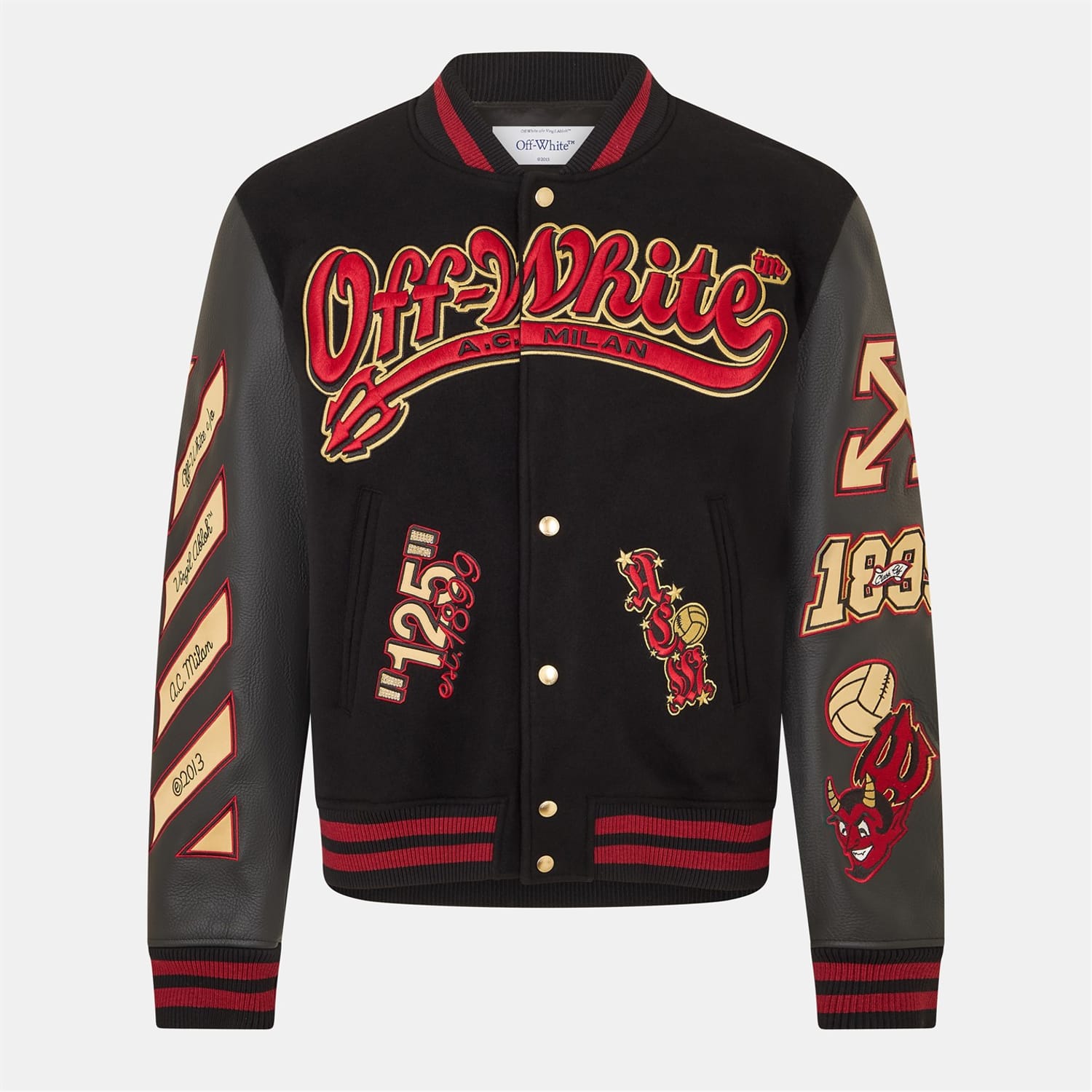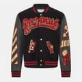 This Off-White varsity jacket features a ribbed crew neck and ribbed collar, offering a classic look. The jacket is designed with a snap button closure and ribbed cuffs for a secure fit. It showcases a striking color block pattern with a large genie graphic and embroidered logo embellishments, adding a unique touch. The regular fit ensures comfort, while the ribbed hem completes the design. -