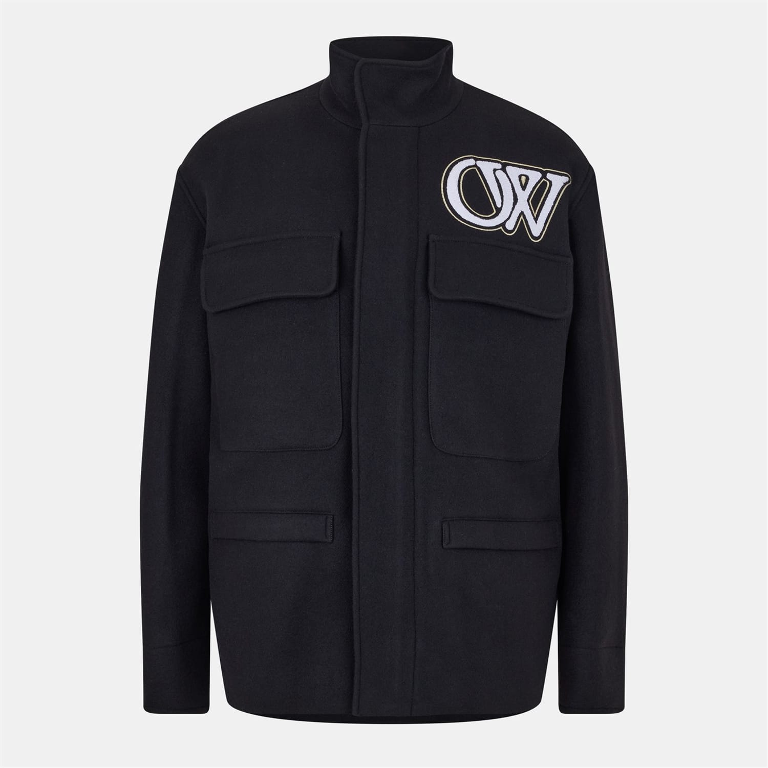 This Off-White puffer jacket features a short length with a regular fit, offering a stylish and comfortable option for cooler weather. The jacket is designed with a solid pattern and a straight hem, complemented by a zipper closure. Embellished with a logo, patch, and pocket, it also includes distinctive lettering graphics, making it a standout piece in any wardrobe. -