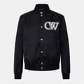 This Off-White bomber jacket features a short length and a bomber collar, offering a classic silhouette. The jacket is designed with a ribbed crew neck, ribbed cuffs, and a ribbed hem for added comfort. It has a snap button closure and showcases a solid pattern with logo embellishments and distinctive lettering graphics. The regular fit ensures a comfortable wear. -