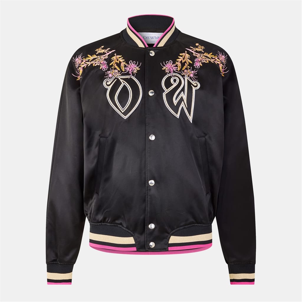 This Off-White varsity jacket features a regular fit with a ribbed crew neck and ribbed cuffs. The snap button closure adds a classic touch, while the embroidered logo and floral pattern provide a stylish flair. The ribbed hem and collar enhance the overall design, complemented by cuff sleeves and distinctive lettering. -