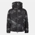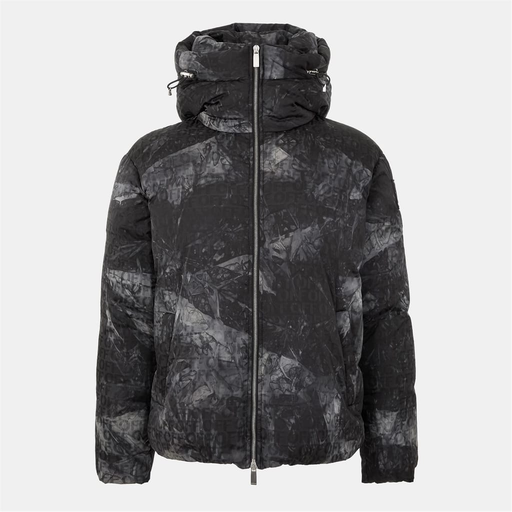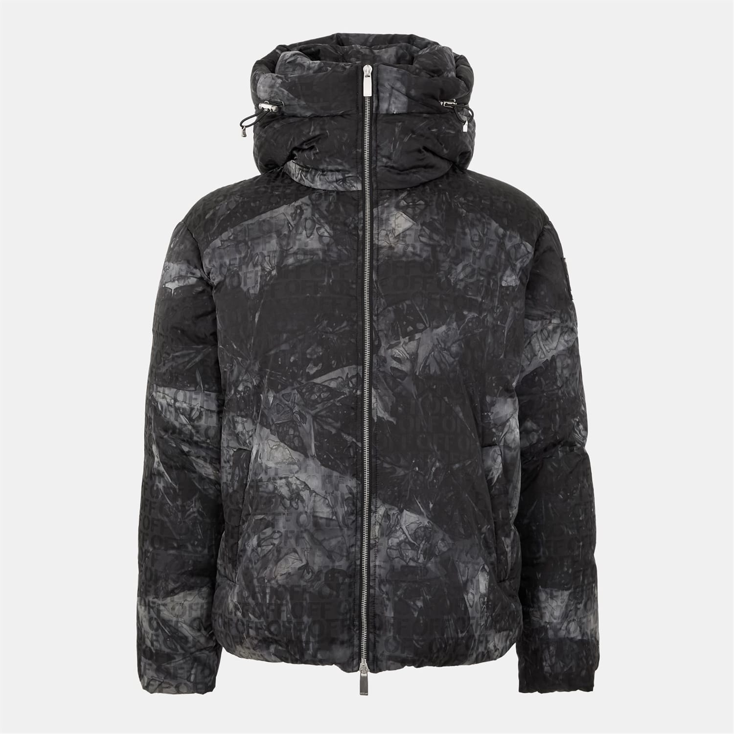 This Off-White puffer coat features a hooded neckline and a zipper closure, offering a regular fit. The short length and straight hem provide a contemporary silhouette. Adorned with a graphic print and logo embellishment, this coat combines style and functionality. -