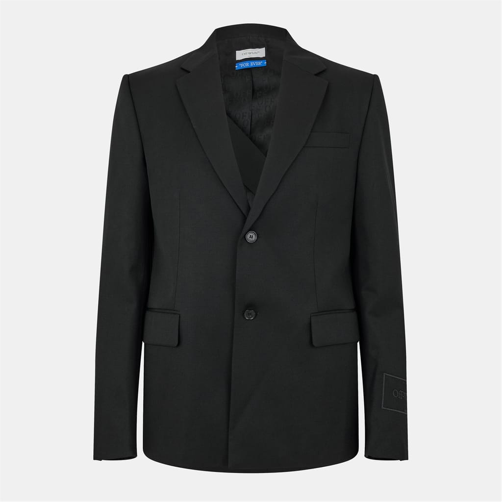 This Off-White blazer from the workwear collection features a notch collar and a straight hem. Crafted in a solid pattern, it offers a regular fit with a button closure. The design is completed with a subtle logo embellishment, making it a versatile addition to any wardrobe. -