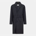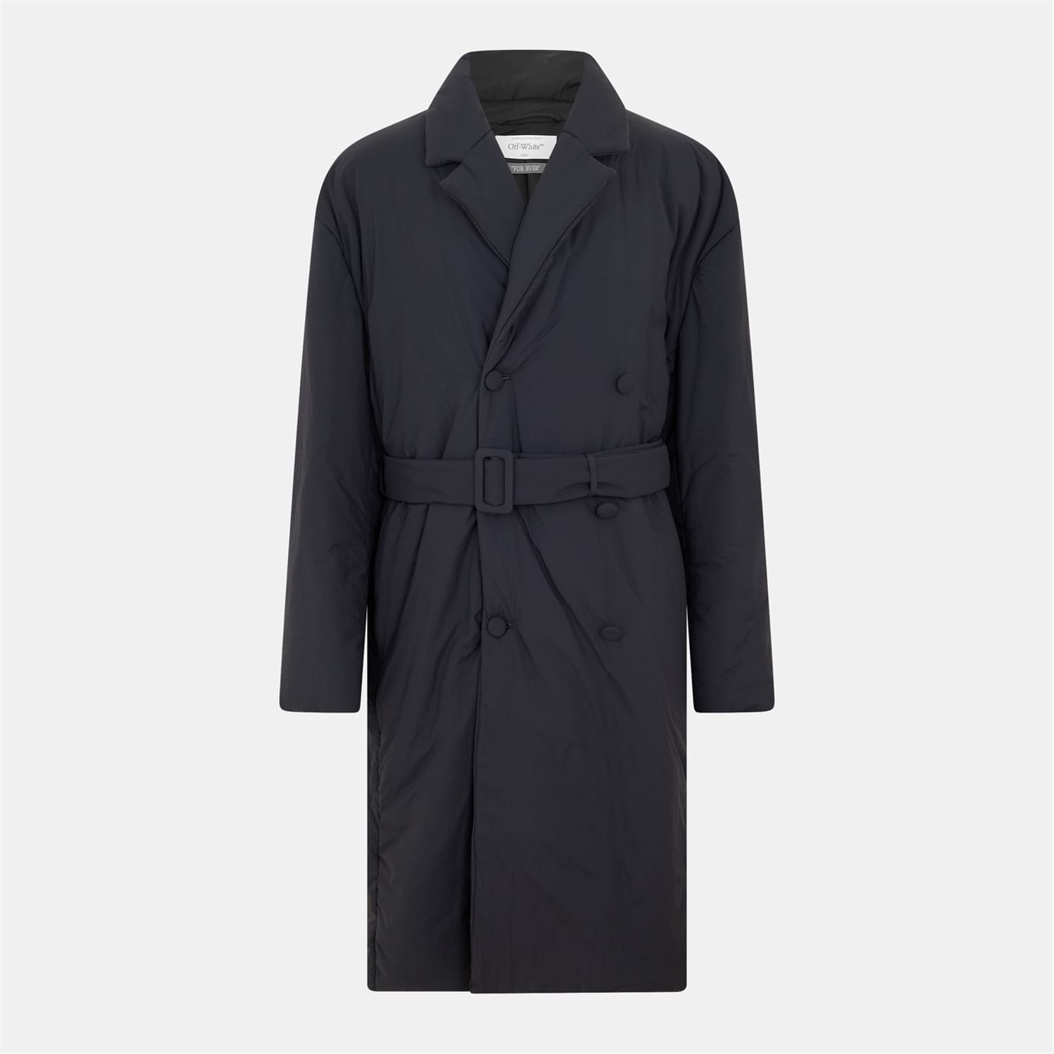The Off-White overcoat is a stylish addition to your wardrobe. Featuring a lapel collar, this padded coat offers a relaxed fit with a straight hem. The solid pattern adds a classic touch, while the button and belt closure provide a secure fit. Practical pockets enhance functionality, making it a versatile choice for various occasions. -