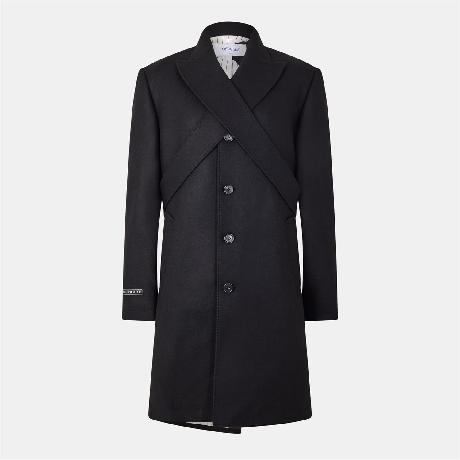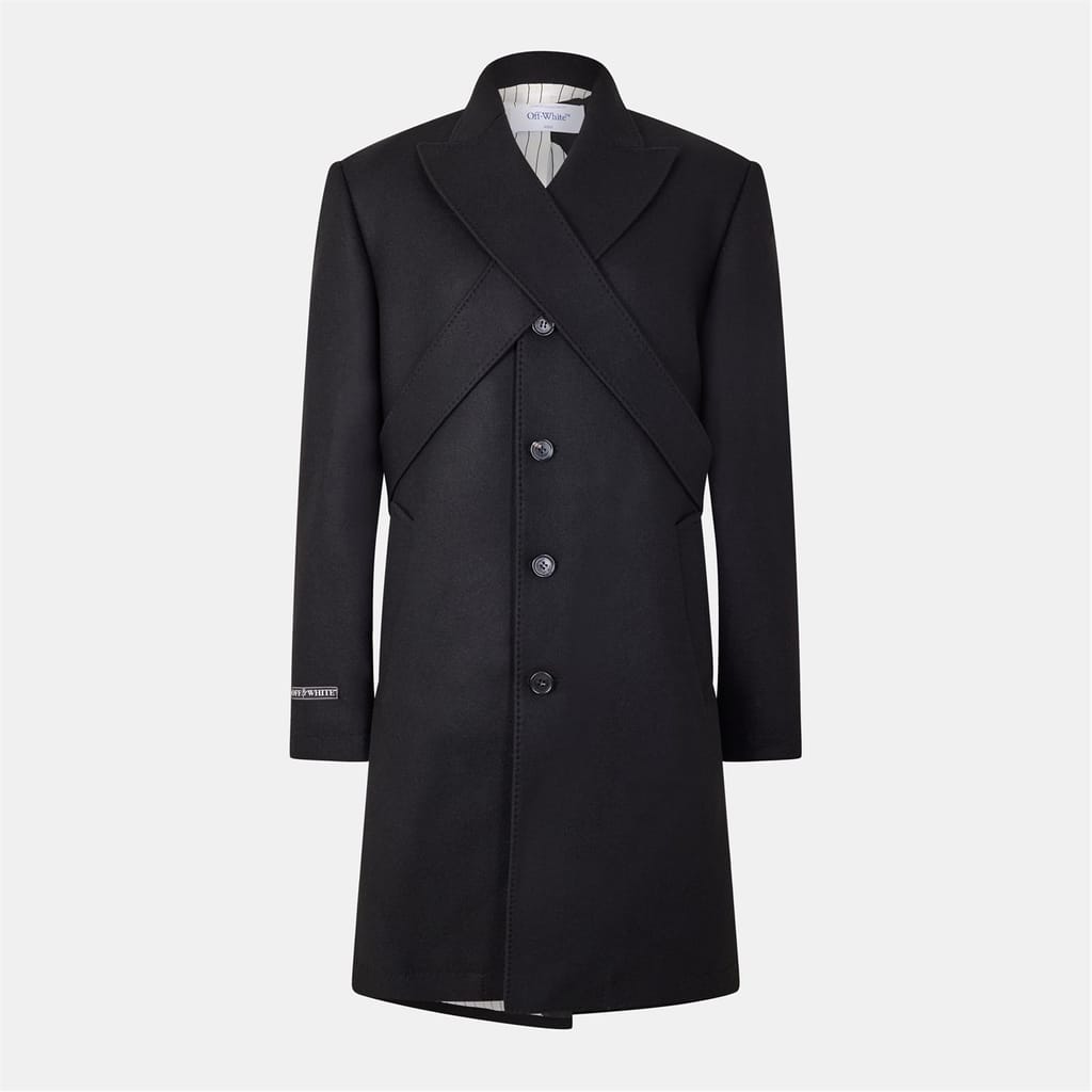 This Off-White overcoat is perfect for winter, featuring a relaxed fit and a shawl collar. The solid pattern and straight hem offer a classic look, while the button closure ensures a secure fit. The coat is embellished with a logo, adding a touch of brand identity. -