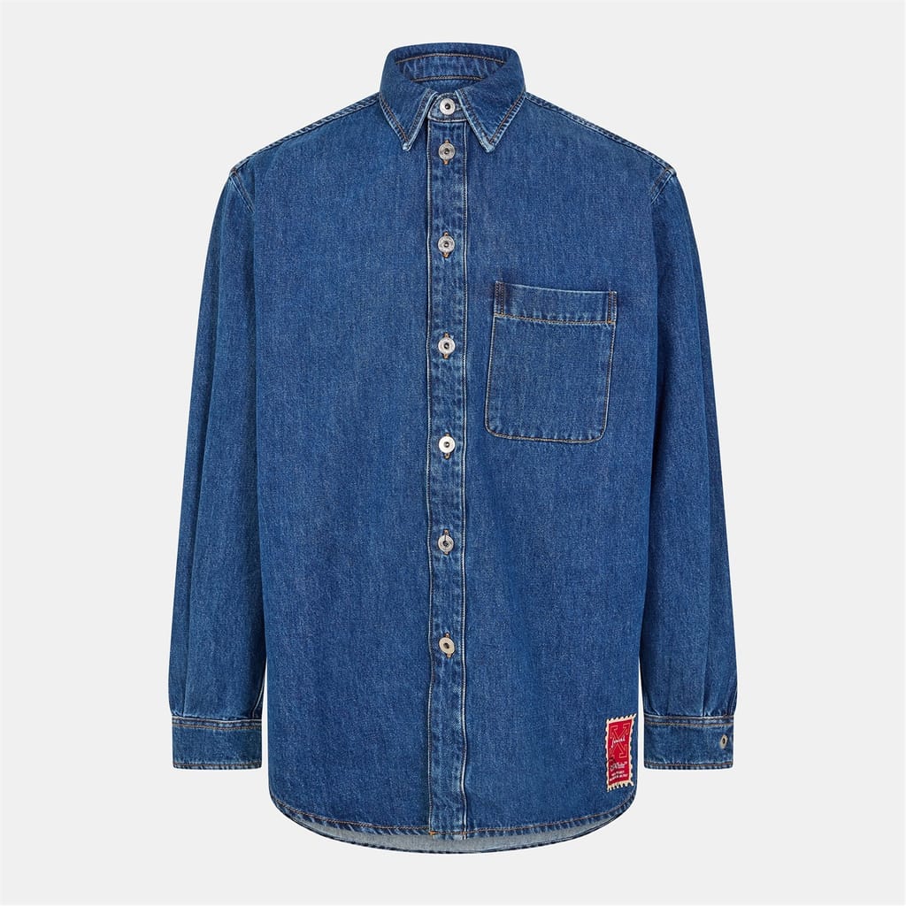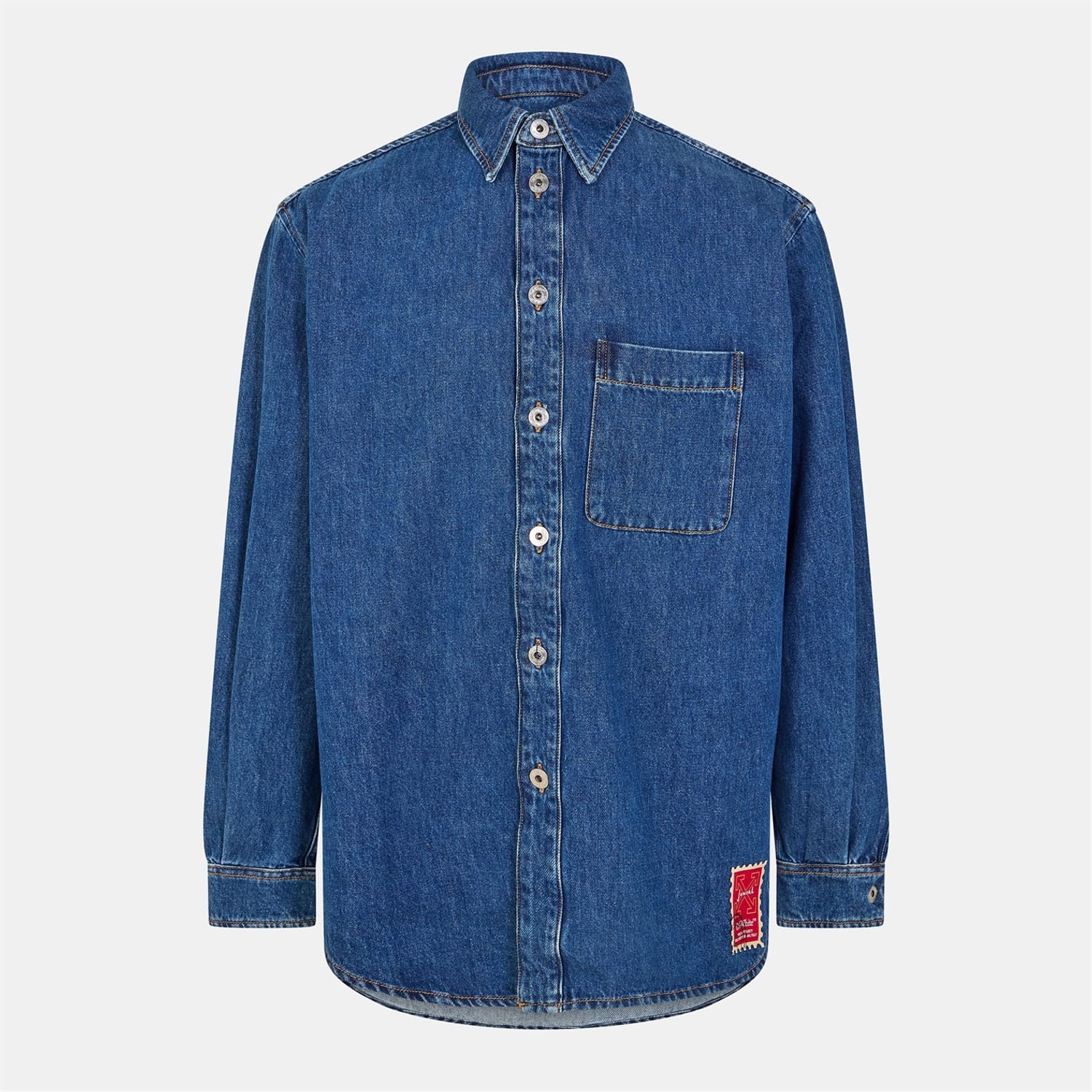 This Off-White puffer coat features a relaxed fit with a solid pattern. It is designed with a shirt collar and a curved hem, offering a contemporary look. The coat includes button closure and practical embellishments such as pockets and patches, including a chest pocket, for added functionality. -