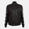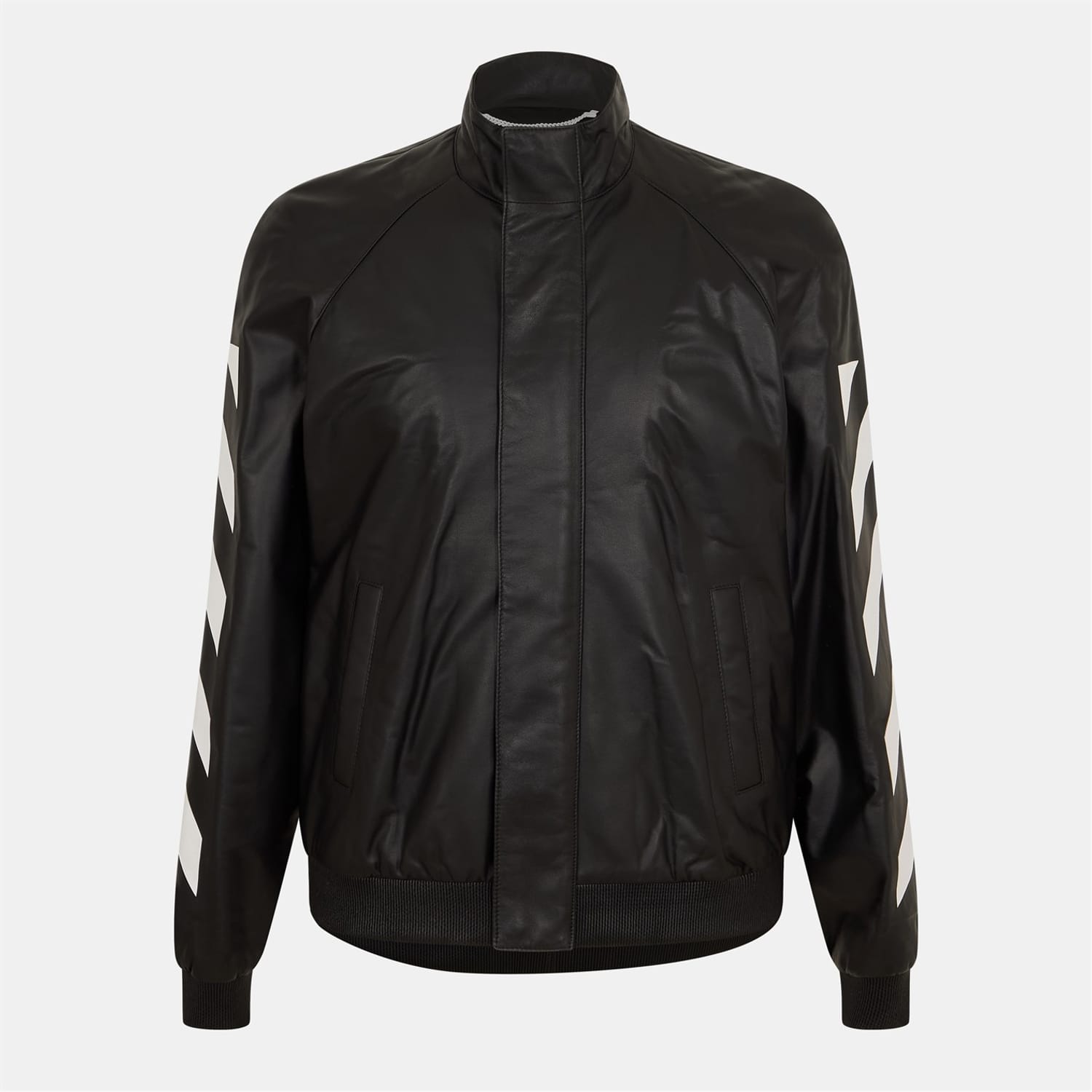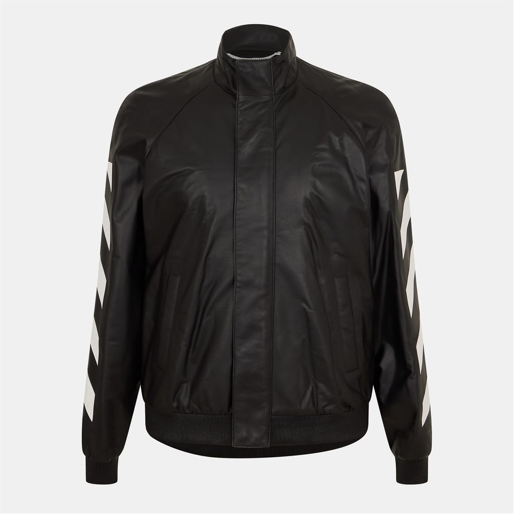 This Off-White bomber jacket features a relaxed fit with raglan sleeves and a solid pattern. It includes a zipper closure, ribbed cuffs, and a ribbed hem for added comfort. The jacket is embellished with a logo and pockets, offering both style and functionality. -