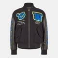 This Off-White bomber jacket features a solid pattern with a regular fit. It is designed with a bomber collar and a ribbed crew neck, complemented by ribbed cuffs and a ribbed hem. The jacket includes a zipper closure and is adorned with logo embellishments, pockets, and patches. The cuff sleeves add a touch of style, while the lettering graphic enhances its unique appeal. -