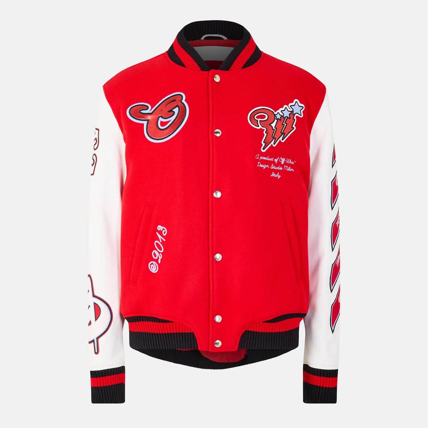 This Off-White varsity jacket features a ribbed crew neck and ribbed collar, offering a classic look. The snap button closure ensures ease of wear, while the ribbed hem and cuffs provide a snug fit. Embellished with a logo, pockets, and embroidery, it also showcases a striking scorpion print. The solid pattern and regular fit make it a versatile addition to any wardrobe. -