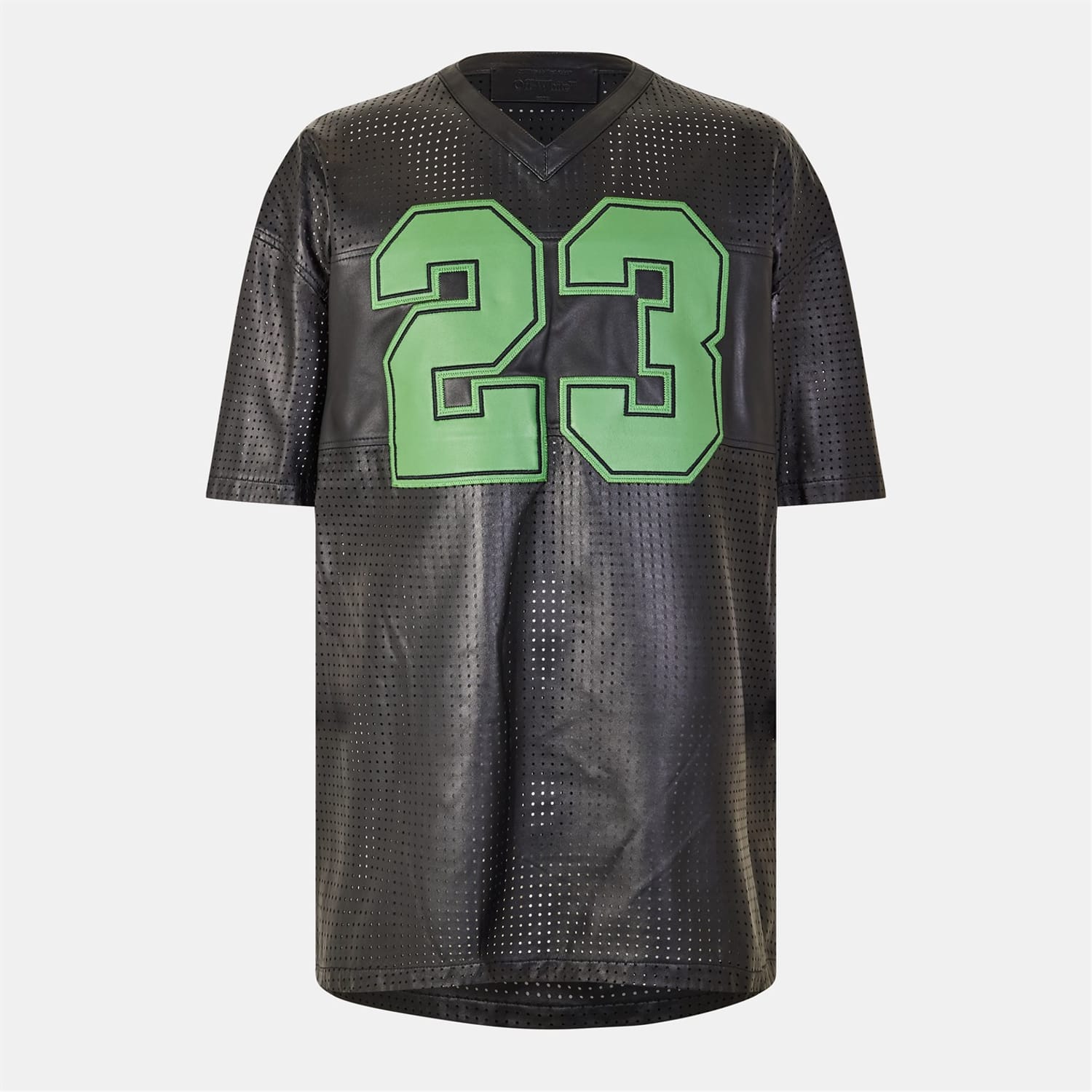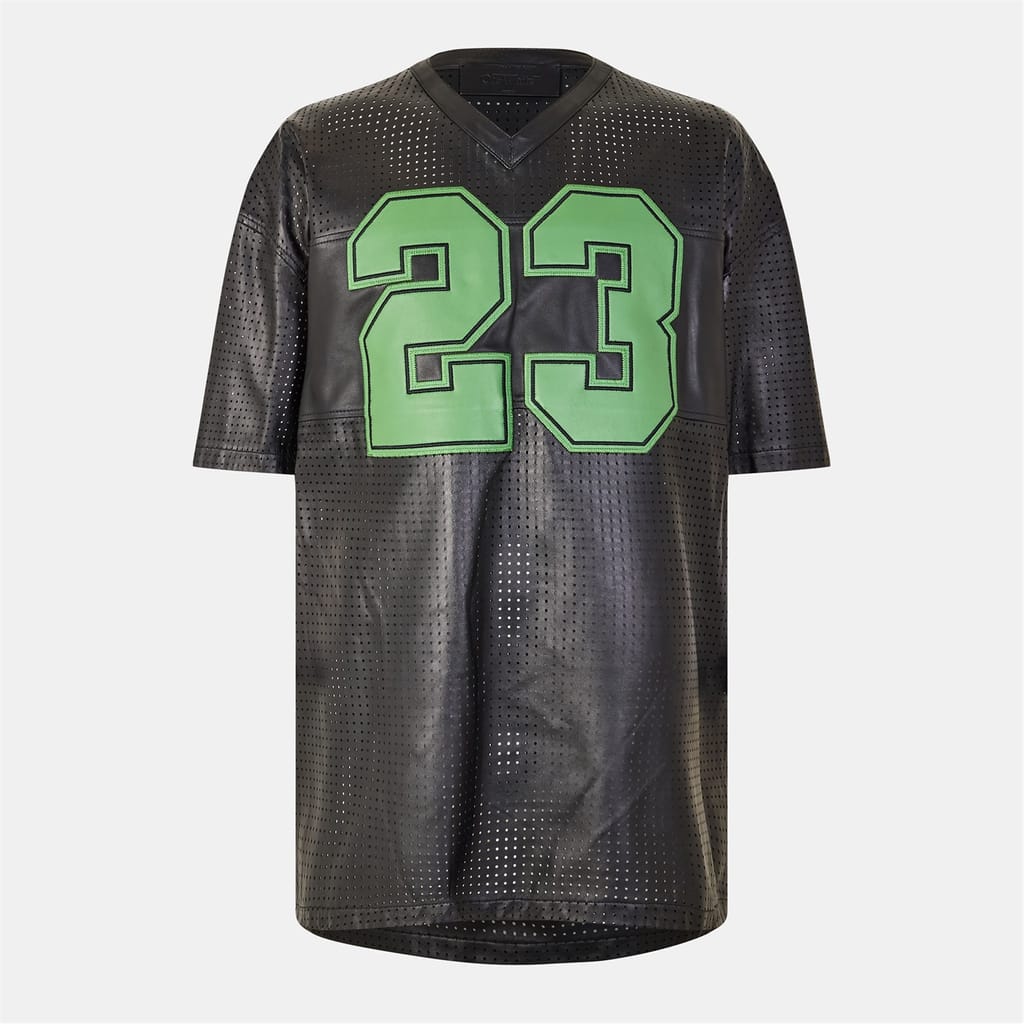This Off-White jacket features a relaxed fit with mesh details and a curved hem. The solid pattern is complemented by a distinctive logo embellishment and a number graphic on the back, adding a unique touch to the design. -