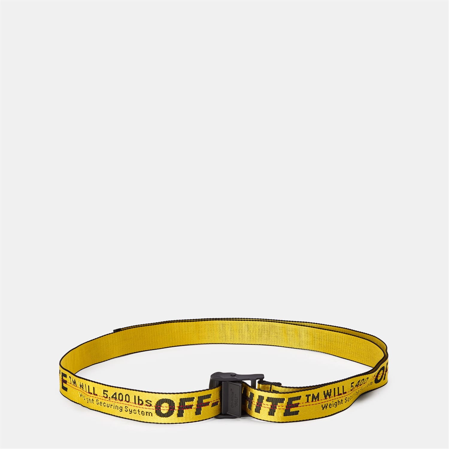 The Off-White belt is a casual accessory featuring a distinctive web style. It comes with a clamp buckle and adjustable length for a comfortable fit. The belt showcases a graphic print with bold lettering and is embellished with the iconic logo, making it a standout piece in any collection. -