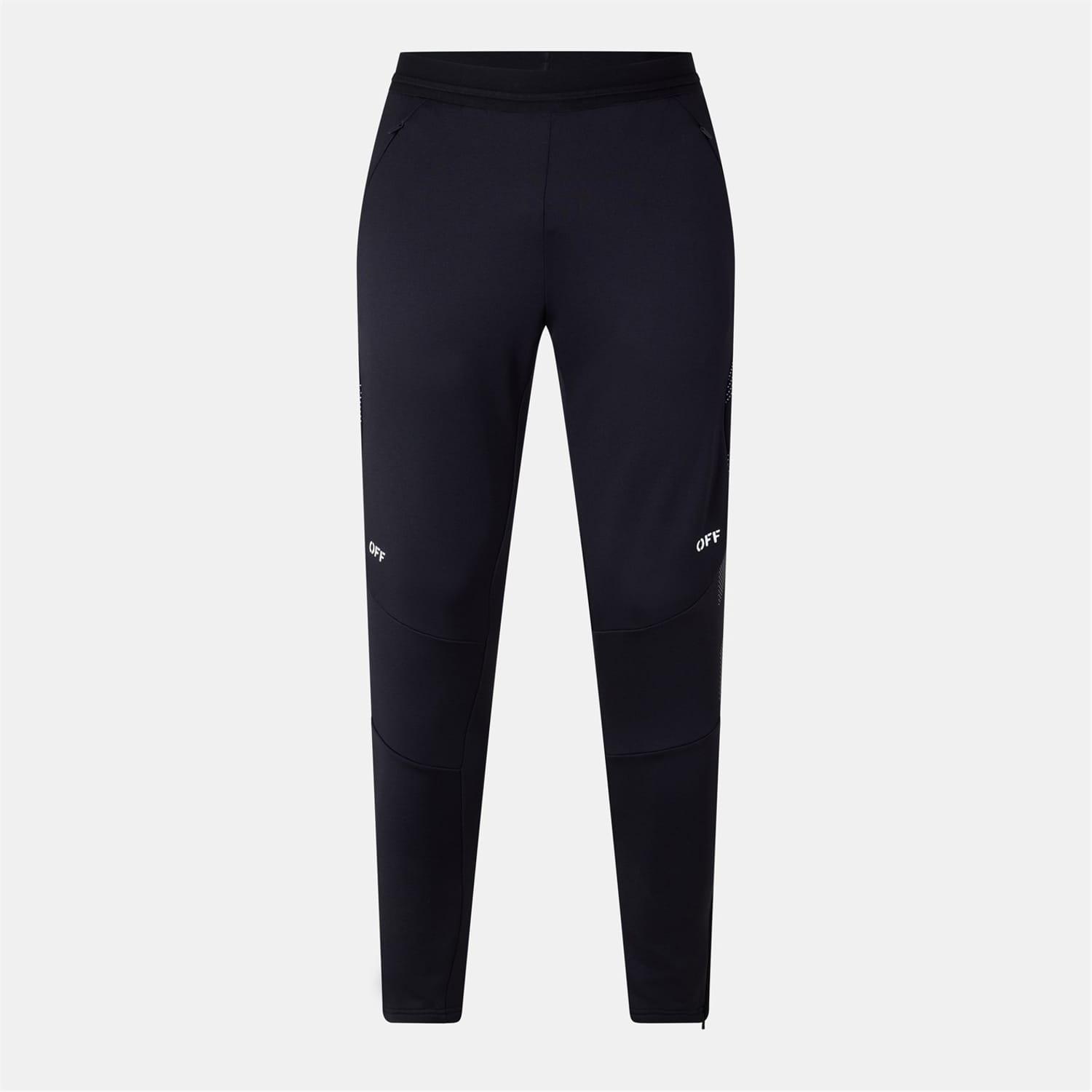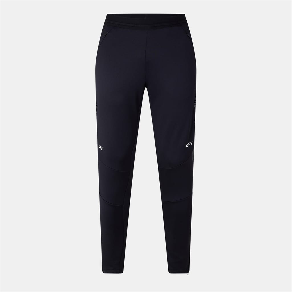 Off White sweatpants offer a stylish blend of comfort and functionality. Crafted from knit material, these pants feature a convenient zipper closure and drawstring for a secure fit. The design is enhanced with a logo and practical pockets, making them a versatile choice for casual wear. -