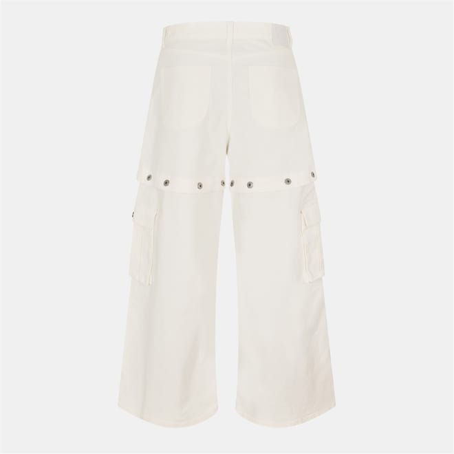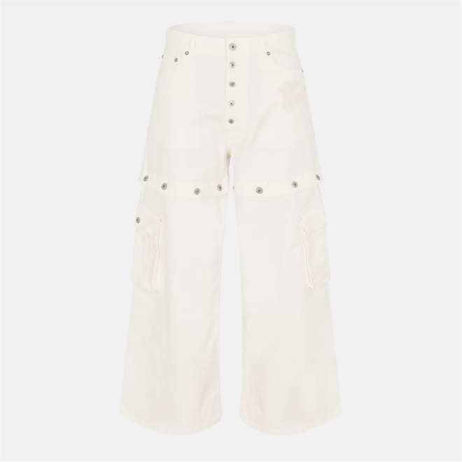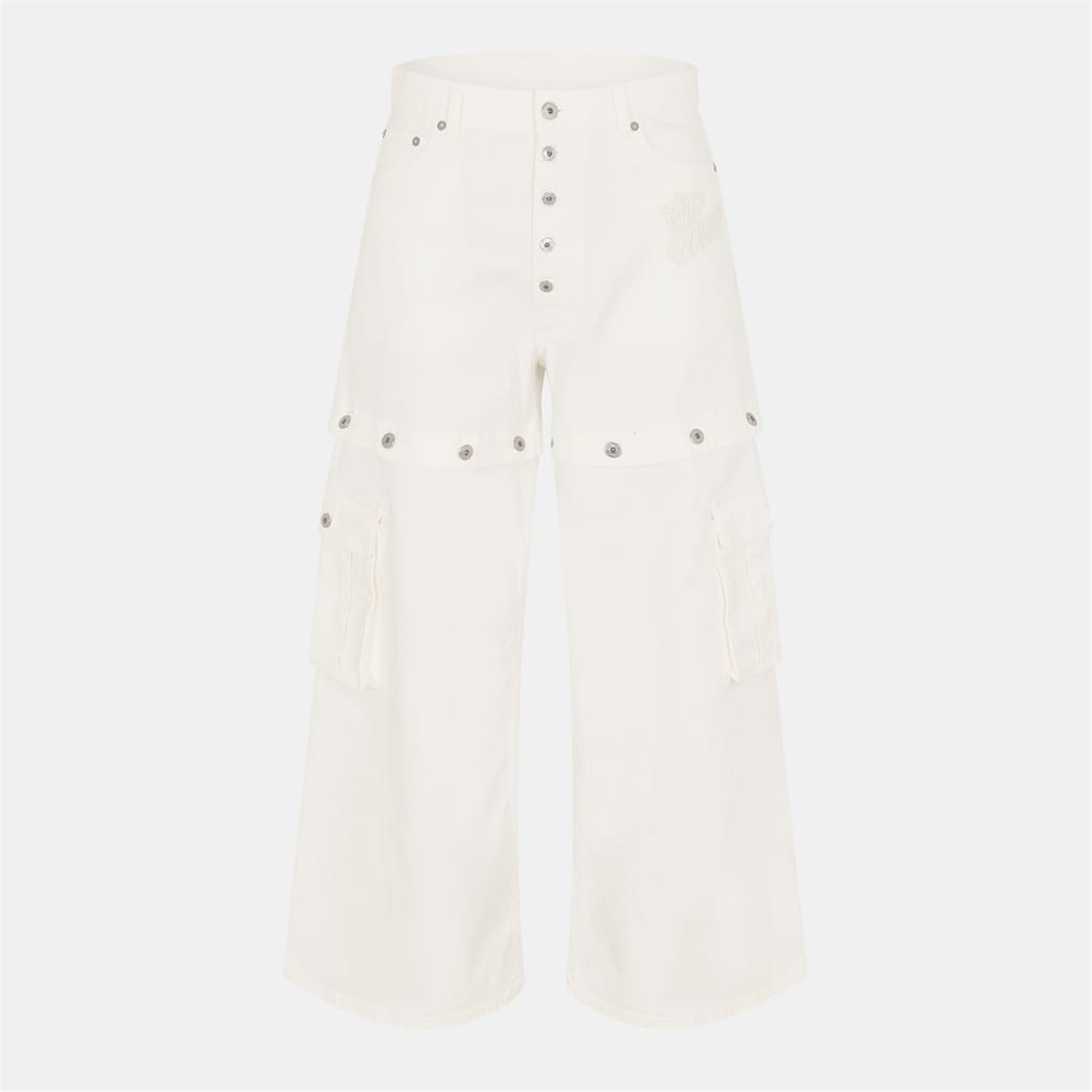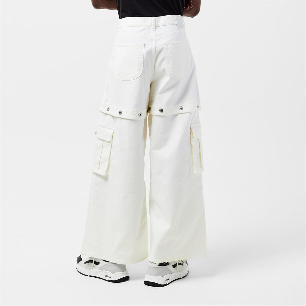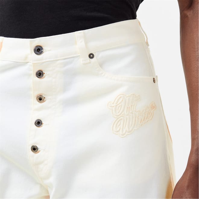Off White wide-leg jeans feature a distinctive logo print and embroidered patch pockets. The button closure and belt loops add functionality, while the button placket enhances the design. These jeans offer a unique style with their wide-leg cut, making them a standout piece in any wardrobe. -