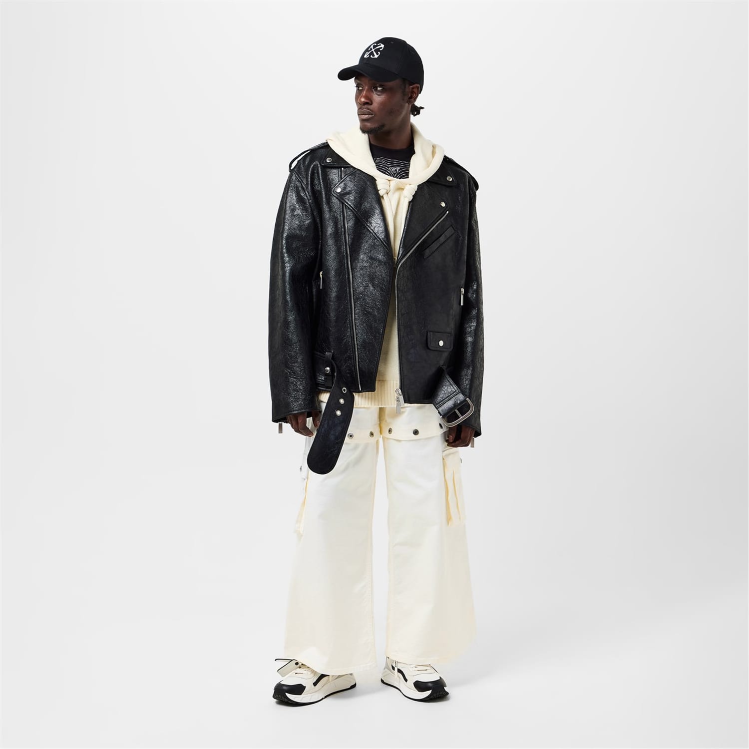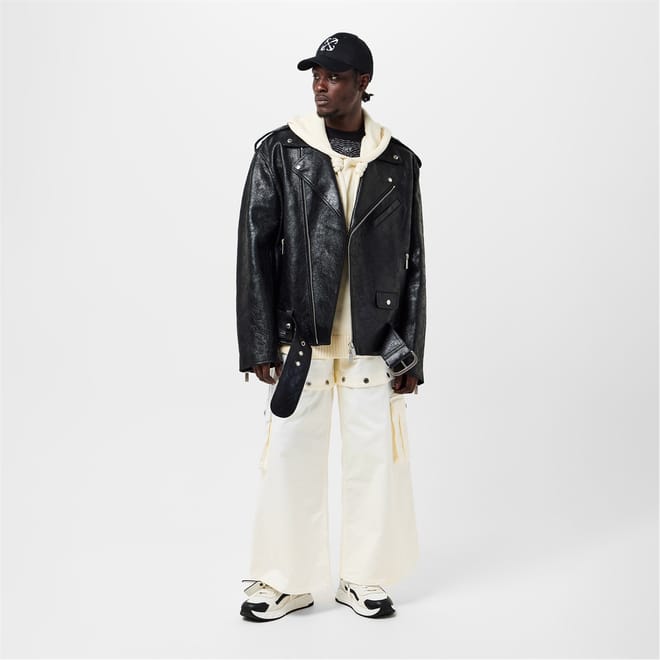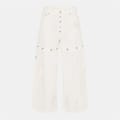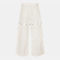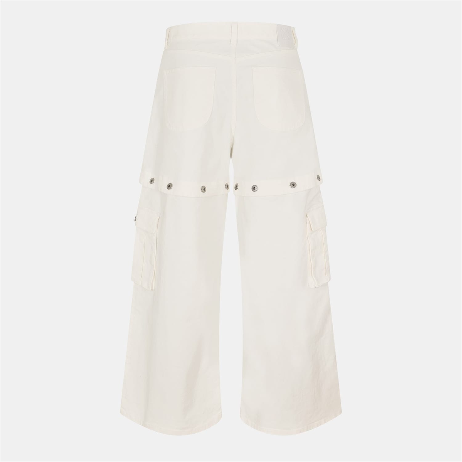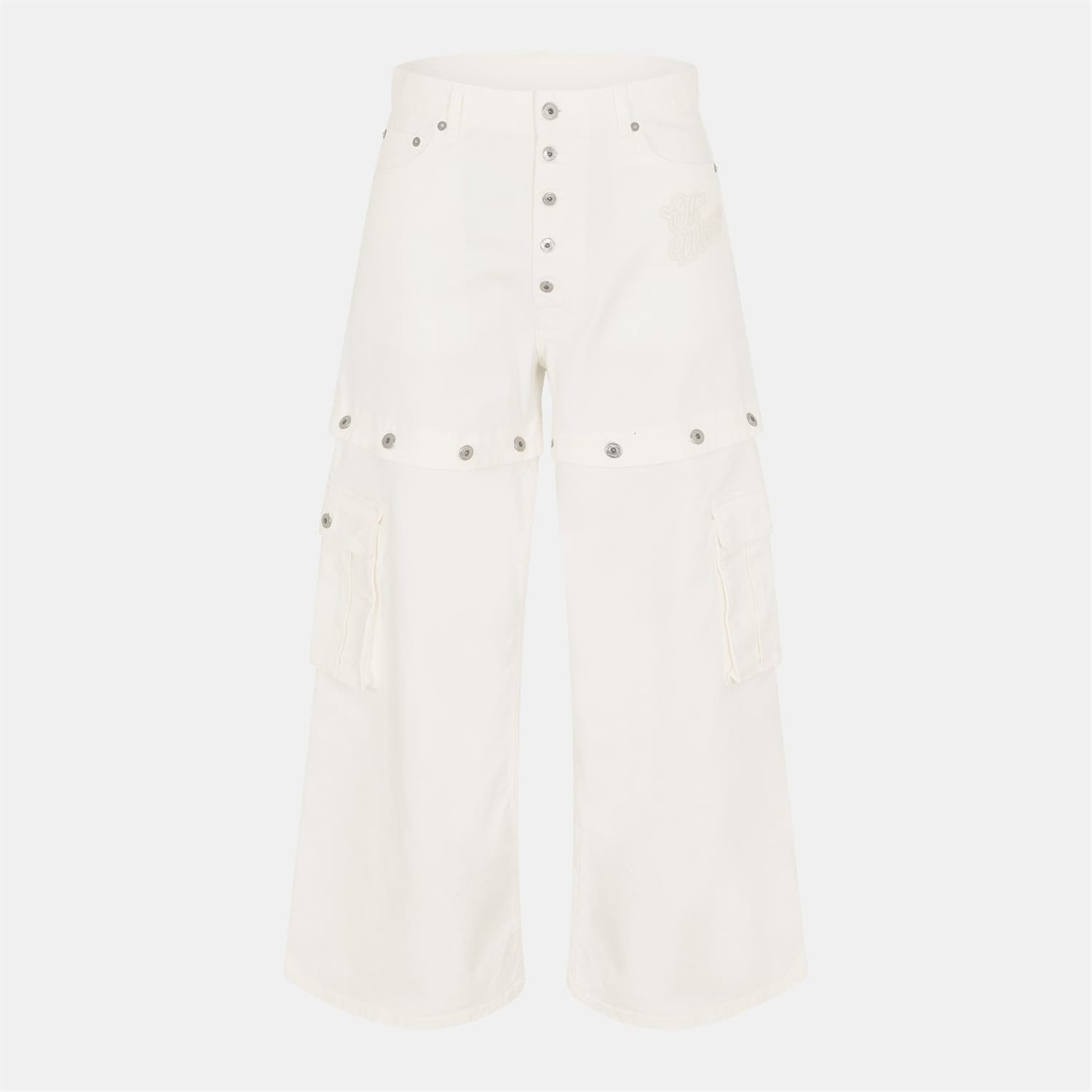 Off White wide-leg jeans feature a distinctive logo print and embroidered patch pockets. The button closure and belt loops add functionality, while the button placket enhances the design. These jeans offer a unique style with their wide-leg cut, making them a standout piece in any wardrobe. -