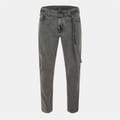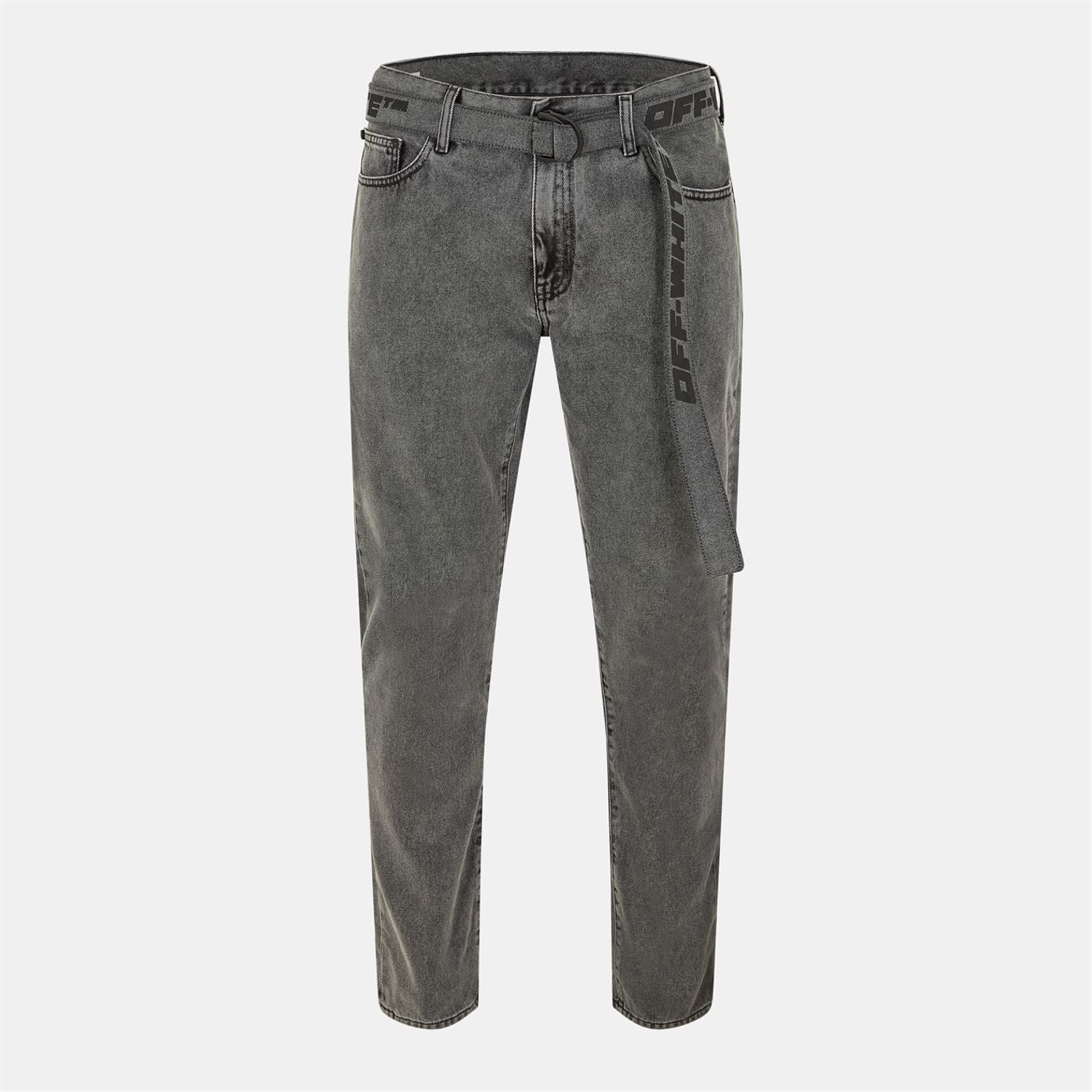 Discover Off White's stone wash jeans, featuring a five pocket design and a skinny fit. These casual jeans come with belt loops, a zip fly, and a belt for a secure closure. The iconic logo embellishment adds a distinctive touch, making them a stylish choice for any wardrobe. -
