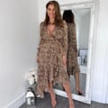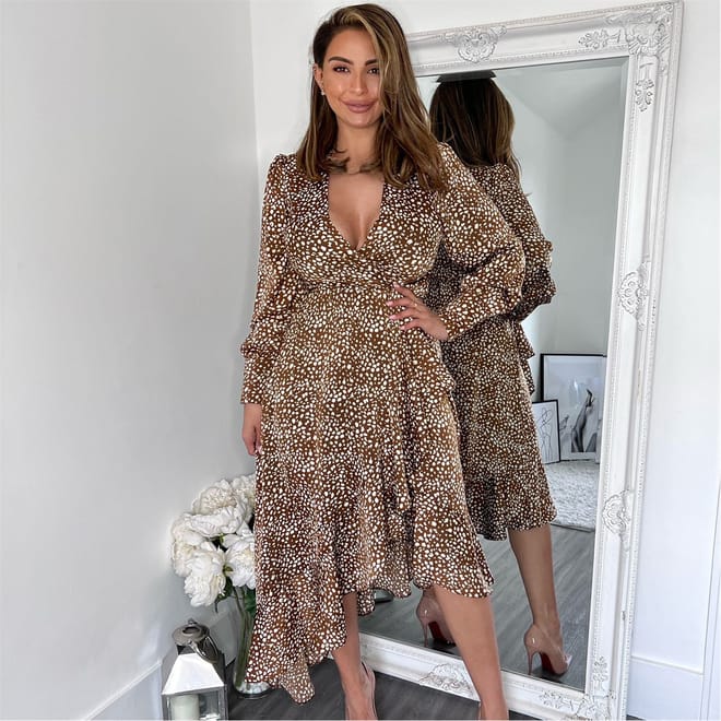 This Brown And Cream Printed V-Neck Long Sleeve Midi Dress is the perfect day dress this season. Featuring an elegant print, long sleeves with deep cuffs, and a gorgeous frill hem midi skirt. Style with strappy heels, headband and a cute saddle bag for trendy day look!