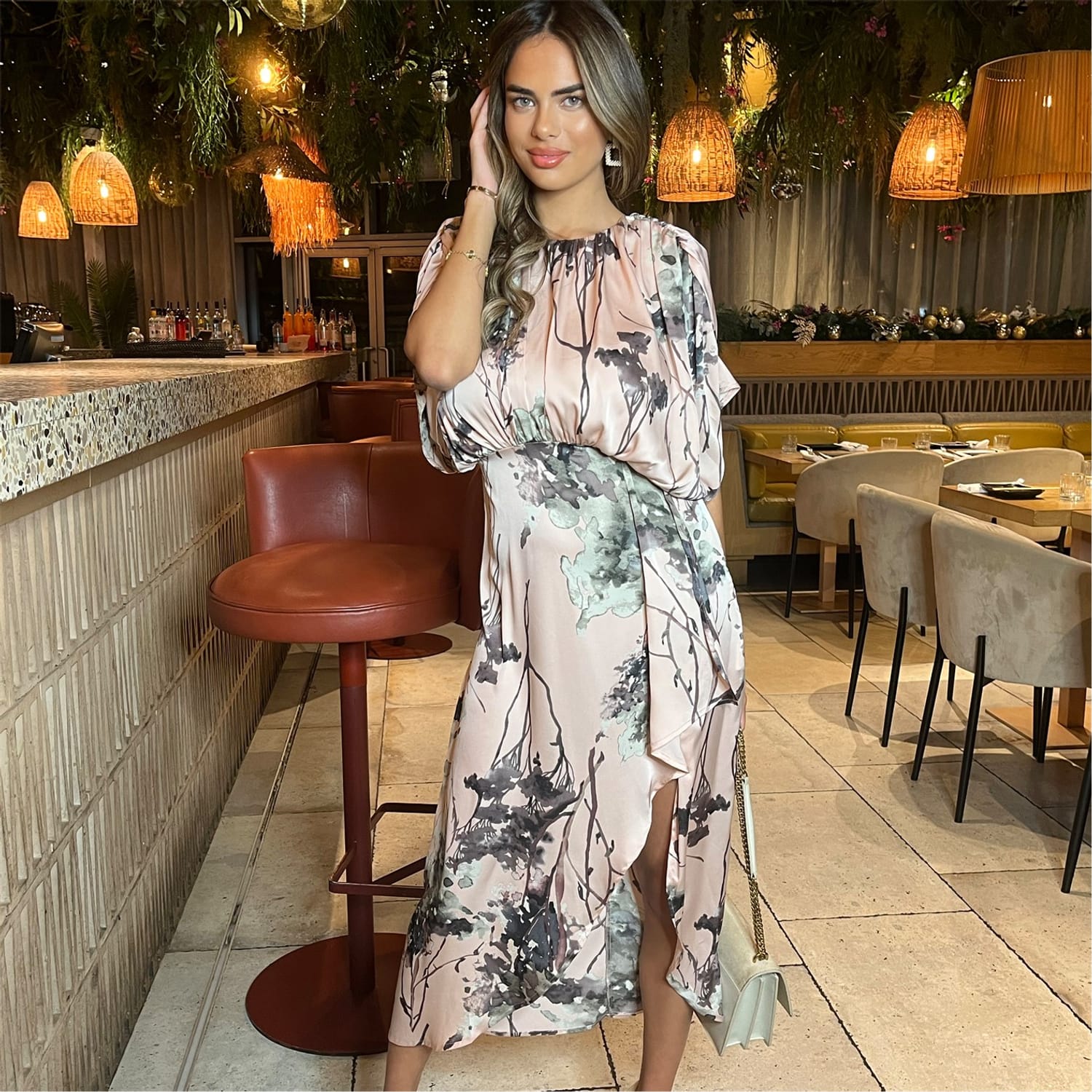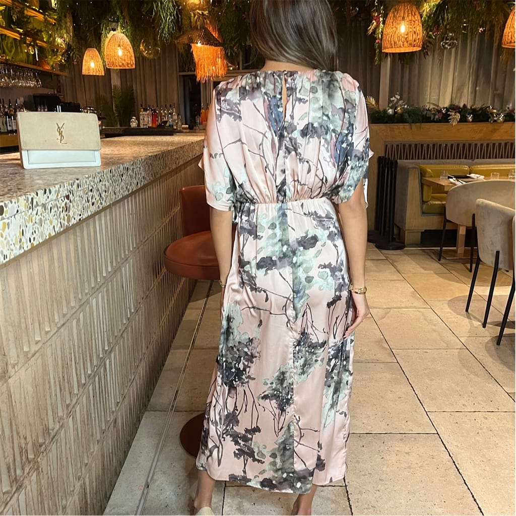 Look and feel gorgeous in our Dusty Pink Printed Batwing Top Wrap Skirt Midi Dress. Featuring a soft satin fabric, a ruched shoulder full top, an elasticated waist, a button back top and a wrap midi length skirt. Style with strappy heels and minimal jewellery for the perfect wedding guest look.