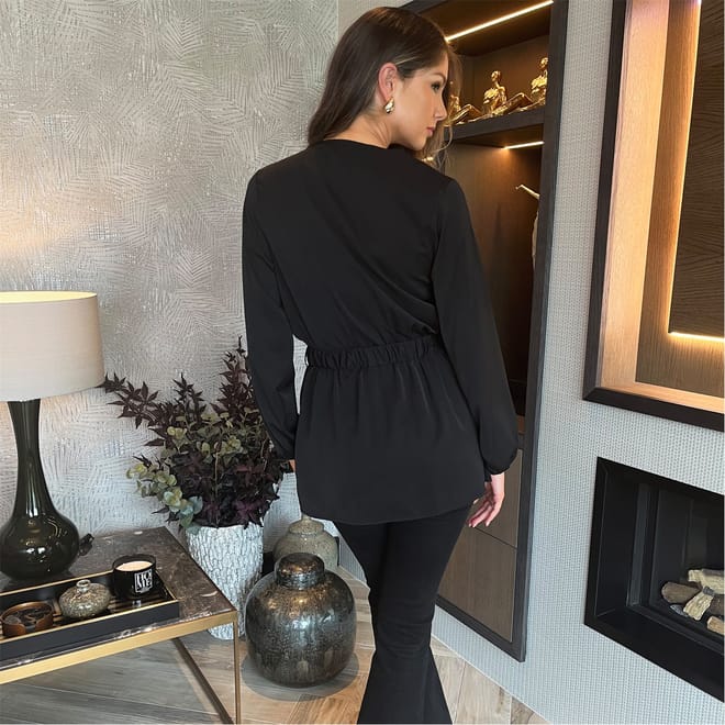 Our flattering Black Long Sleeve Gold Detail Belt Wrap Top will see you from the office to Friday night drinks. Featuring a V shaped wrap top neckline, long elasticated cuff sleeves, an elasticated waist and an elasticated belt with gold detailing. Style with simple jewelry, jeans and some heels for an effortless dressed up look!