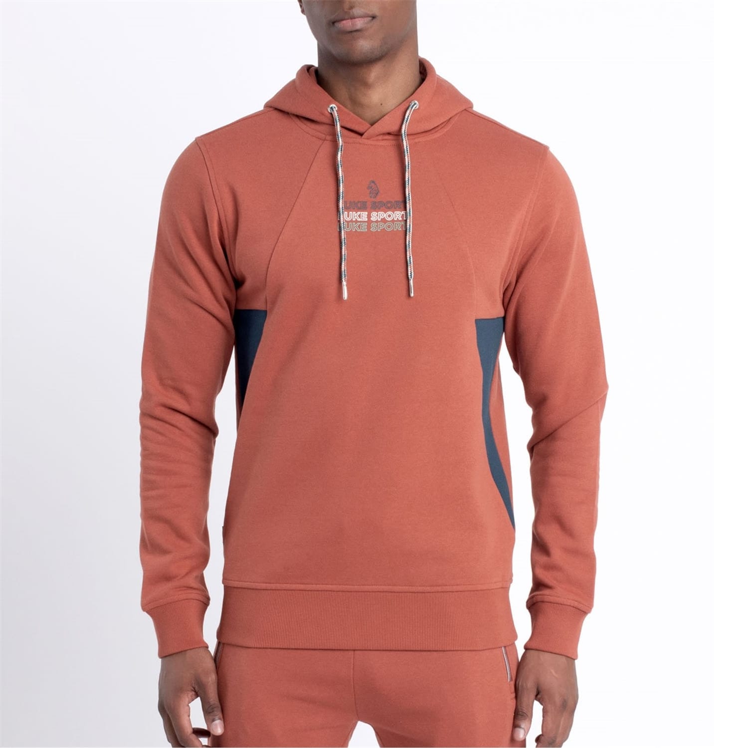 The Luke Munchen top features a hooded neck and long raglan sleeves, offering a regular fit. It is designed with a drawstring closure and ribbed cuffs for added comfort. The solid pattern is complemented by distinctive lettering and a logo embellishment, making it a stylish choice for casual wear. -