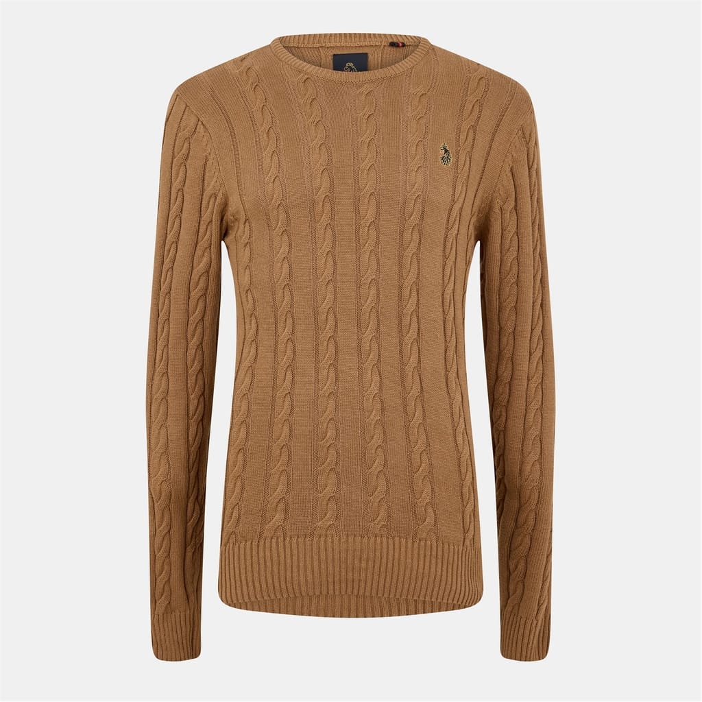 The Luke Aspen top features a classic crew neck and long sleeves, offering a regular fit. Crafted with a cable knit pattern, it includes ribbed cuffs for added comfort. The design is completed with a subtle logo embellishment, making it a versatile addition to any wardrobe. -