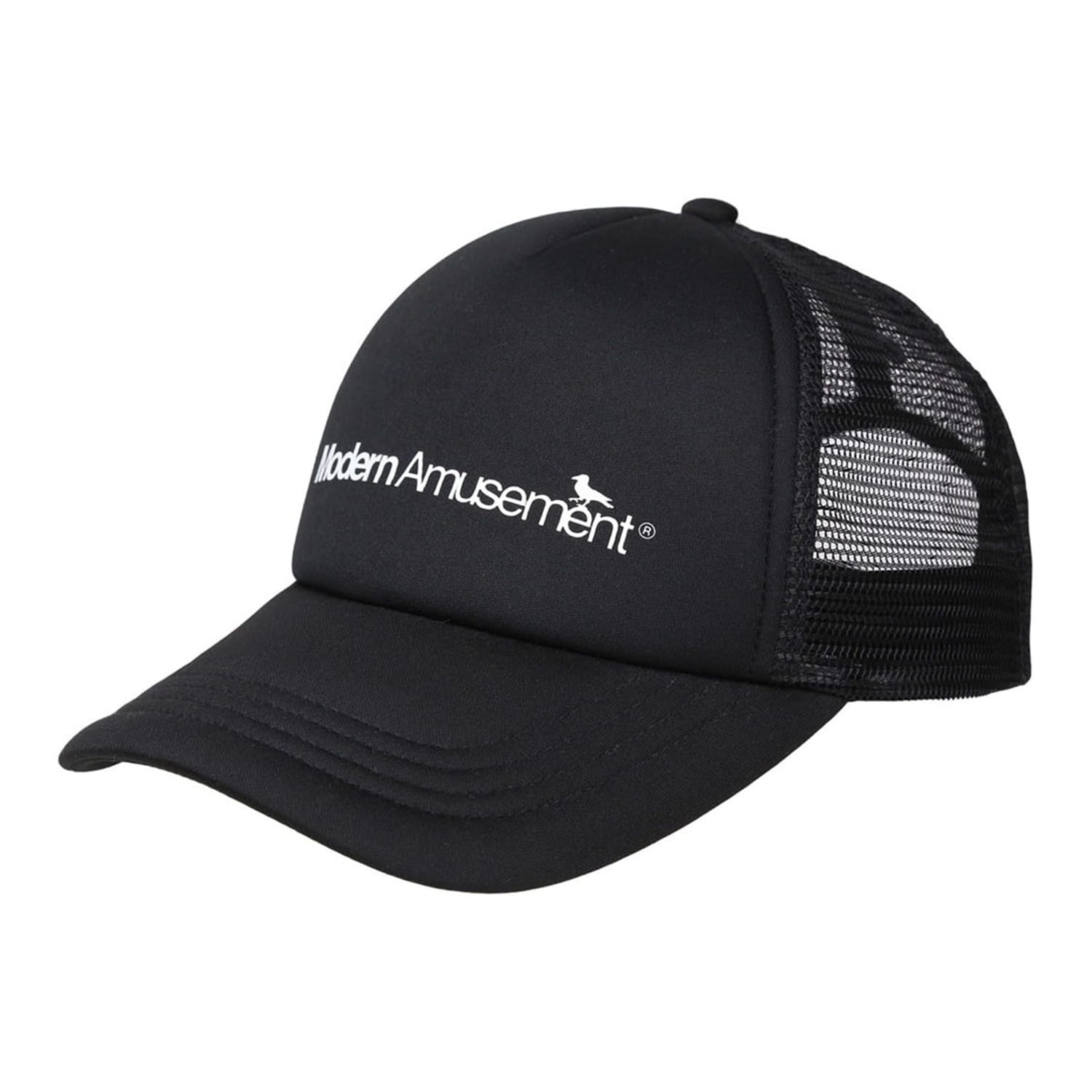 Discover the Modern_Amusement trucker cap, a stylish addition to your headwear collection. Featuring a snap-back closure for a comfortable fit, this cap is adorned with a distinctive logo embellishment. Perfect for those seeking a blend of fashion and functionality in their accessories. -