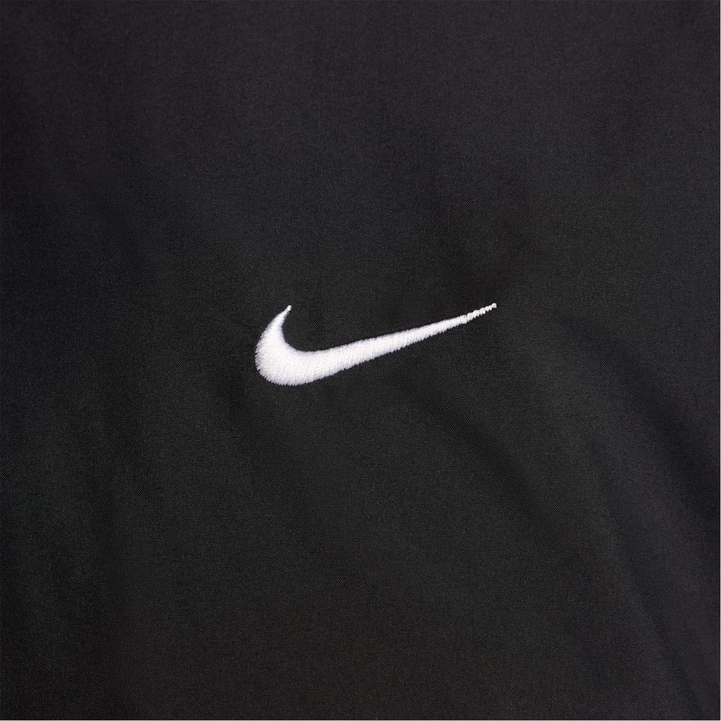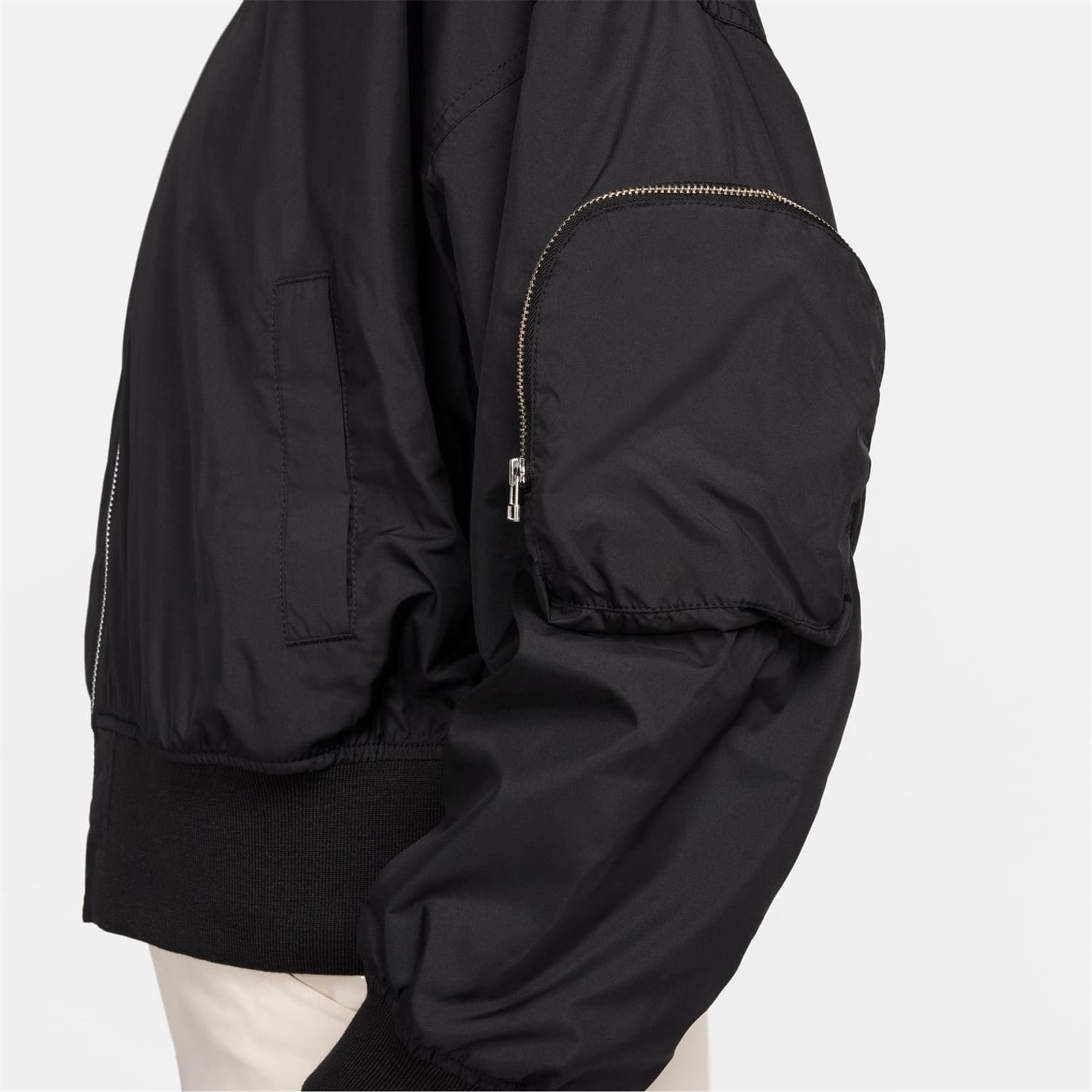 This Nike bomber jacket features a relaxed fit and a short length, perfect for a casual look. It is crafted from mid-weight material with a solid pattern. The jacket includes a ribbed bomber collar, ribbed hem, and ribbed cuffs for added comfort. It has a zipper and snap closure, along with a zipped pocket for practicality. The design is completed with a subtle logo embellishment. -