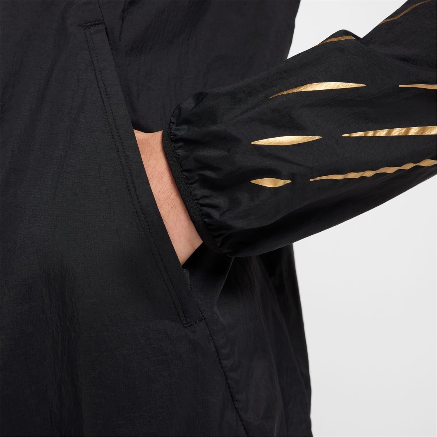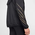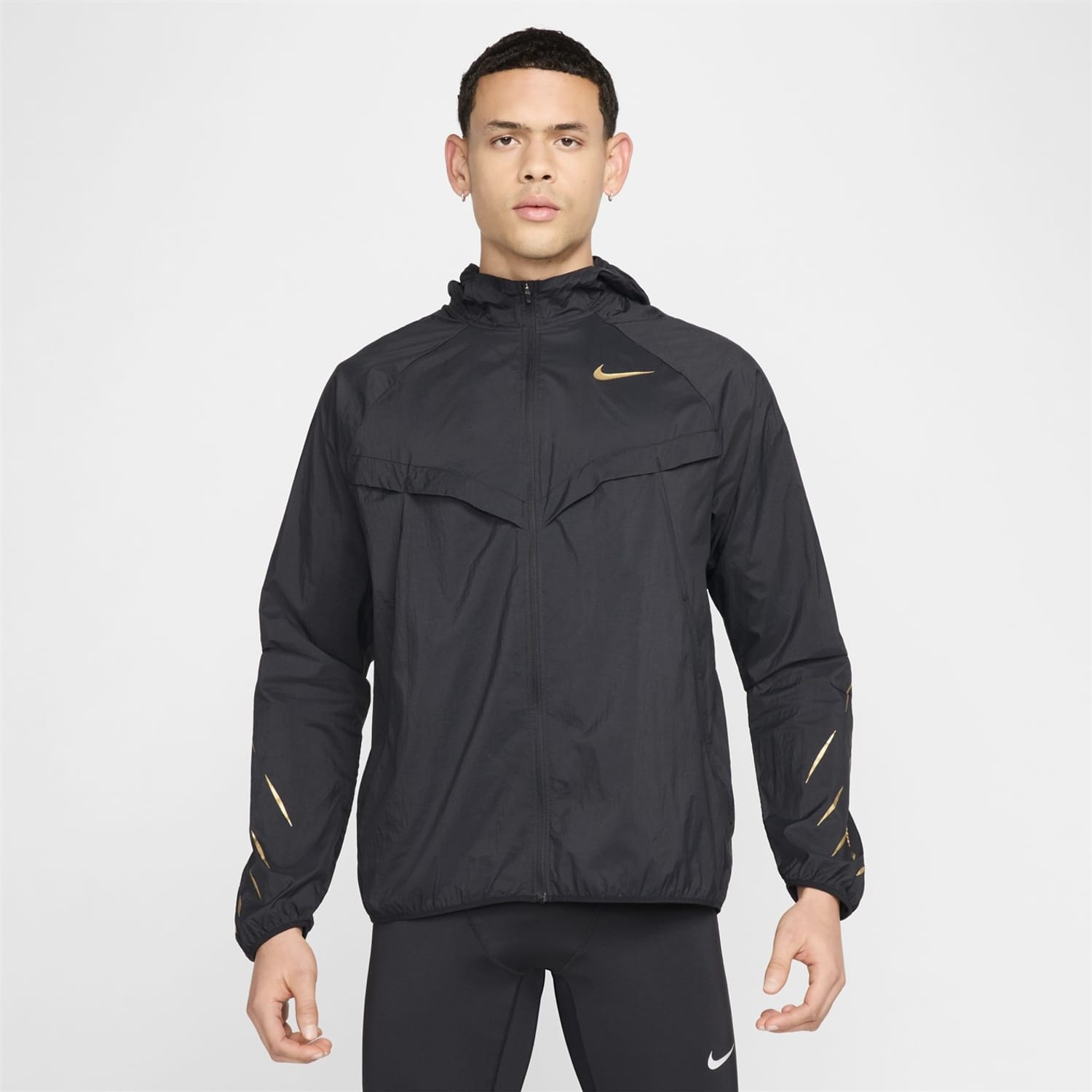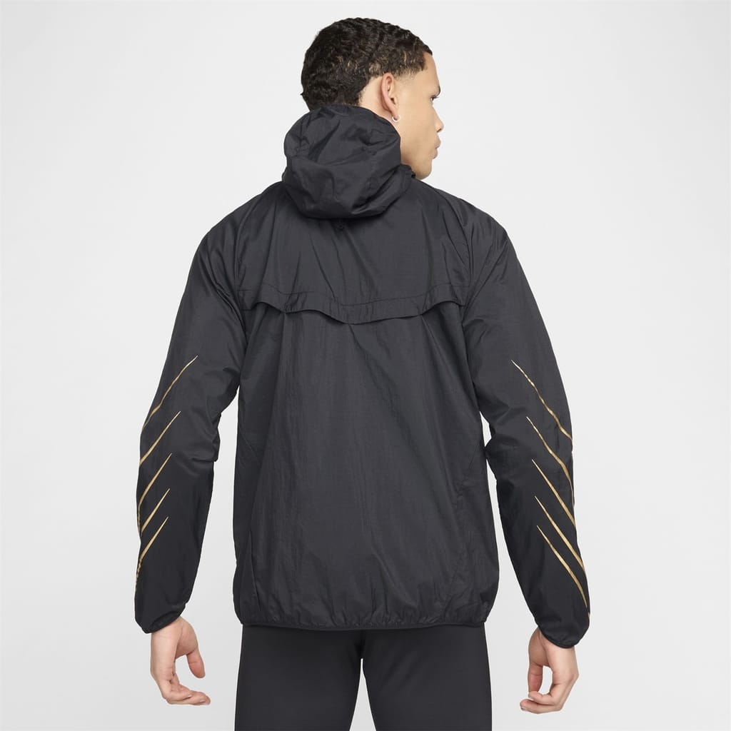 Nike's hooded performance jacket from the activewear collection features a relaxed fit with a solid pattern. It includes a zipper closure and an elasticated cuff, complemented by a straight hem. The jacket is adorned with a logo, adding a touch of brand identity. -