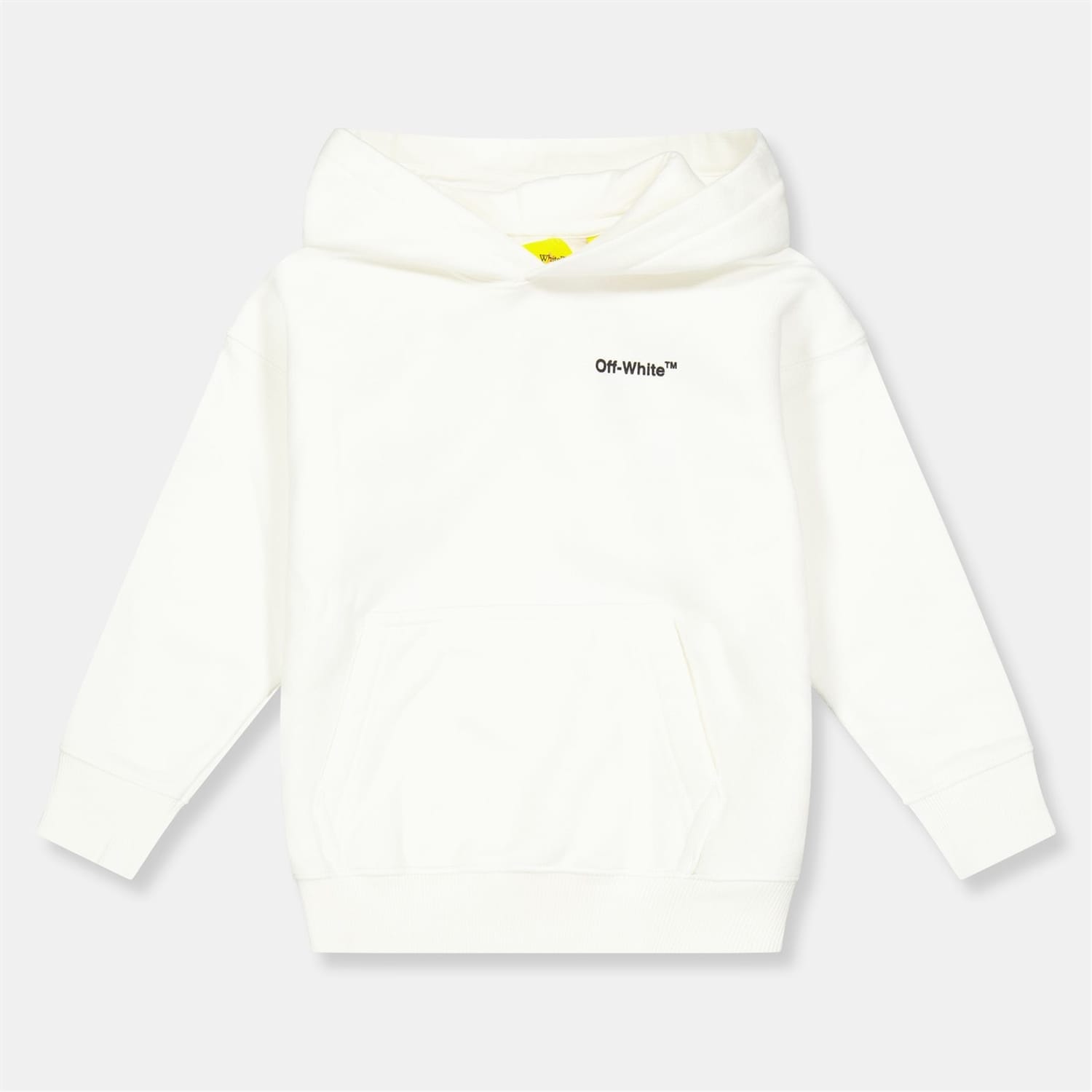 This Off White top features a hooded neck and long sleeves, offering a regular fit. The solid design is complemented by a kangaroo pocket and ribbed cuffs. A logo embellishment adds a distinctive touch, making it a staple in any casual collection. -