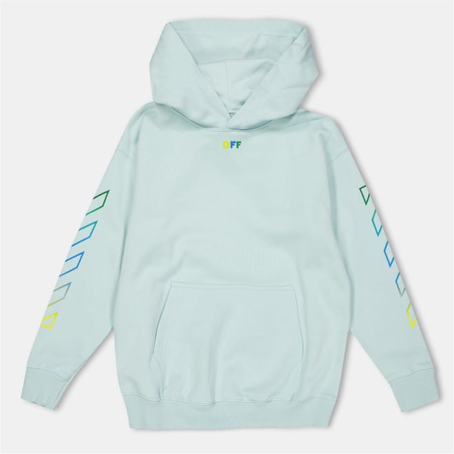 This Off White top features a hooded neck and a relaxed fit, perfect for all seasons. The long sleeves are complemented by ribbed cuffs, while the drawstring closure adds functionality. A graphic print and logo embellishment enhance its casual appeal, making it a standout piece in any wardrobe. -