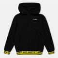 This Off White top features a hooded neck and long sleeves, offering a regular fit. The solid pattern is complemented by a logo embellishment, adding a touch of brand identity. Designed for casual collections, it includes ribbed cuffs for added comfort. -