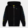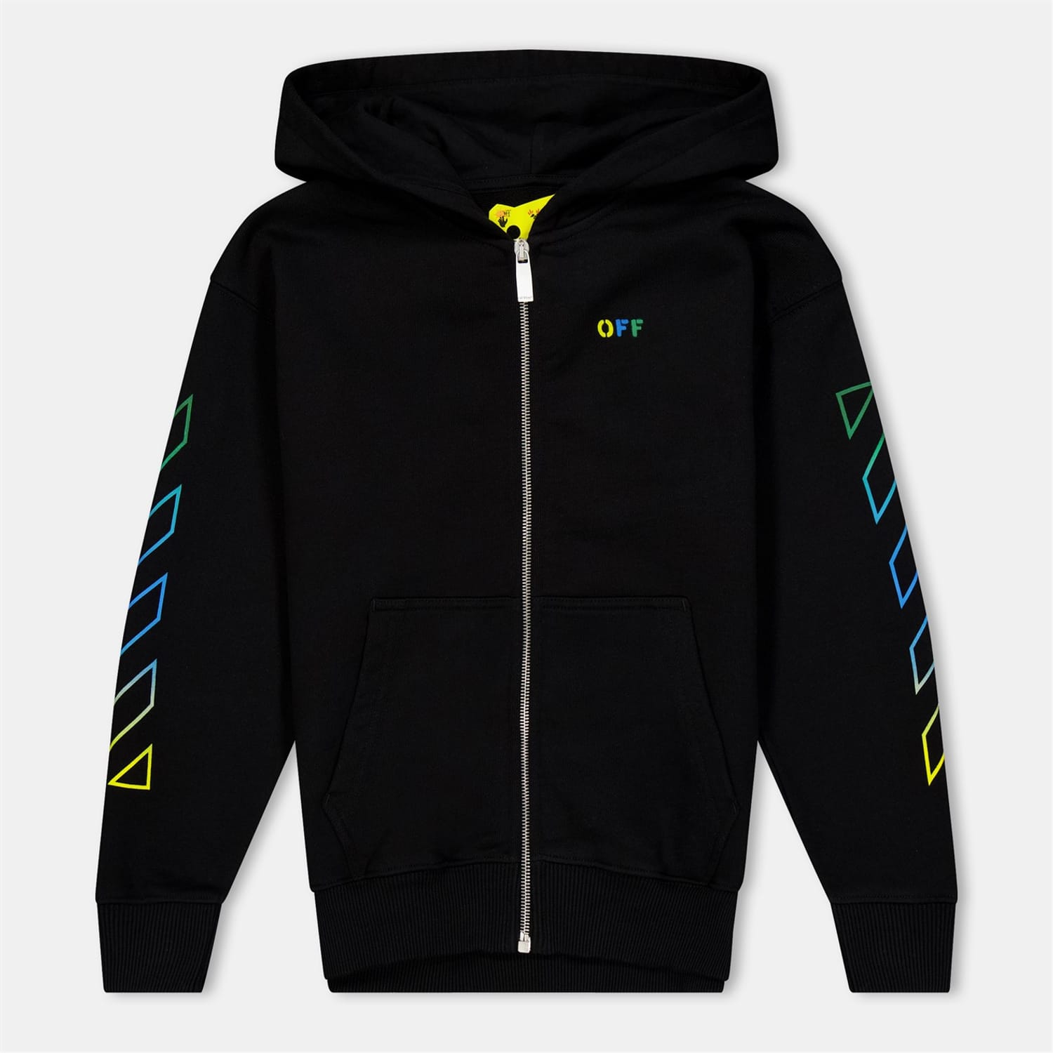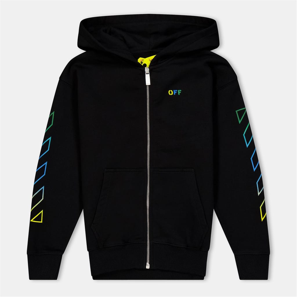 This Off White top from the outerwear collection is perfect for casual wear. It features a full zipper closure and a hooded neck, offering a regular fit with long sleeves. The ribbed cuffs add a touch of style, while the graphic print and printed logo embellishments make it stand out. -