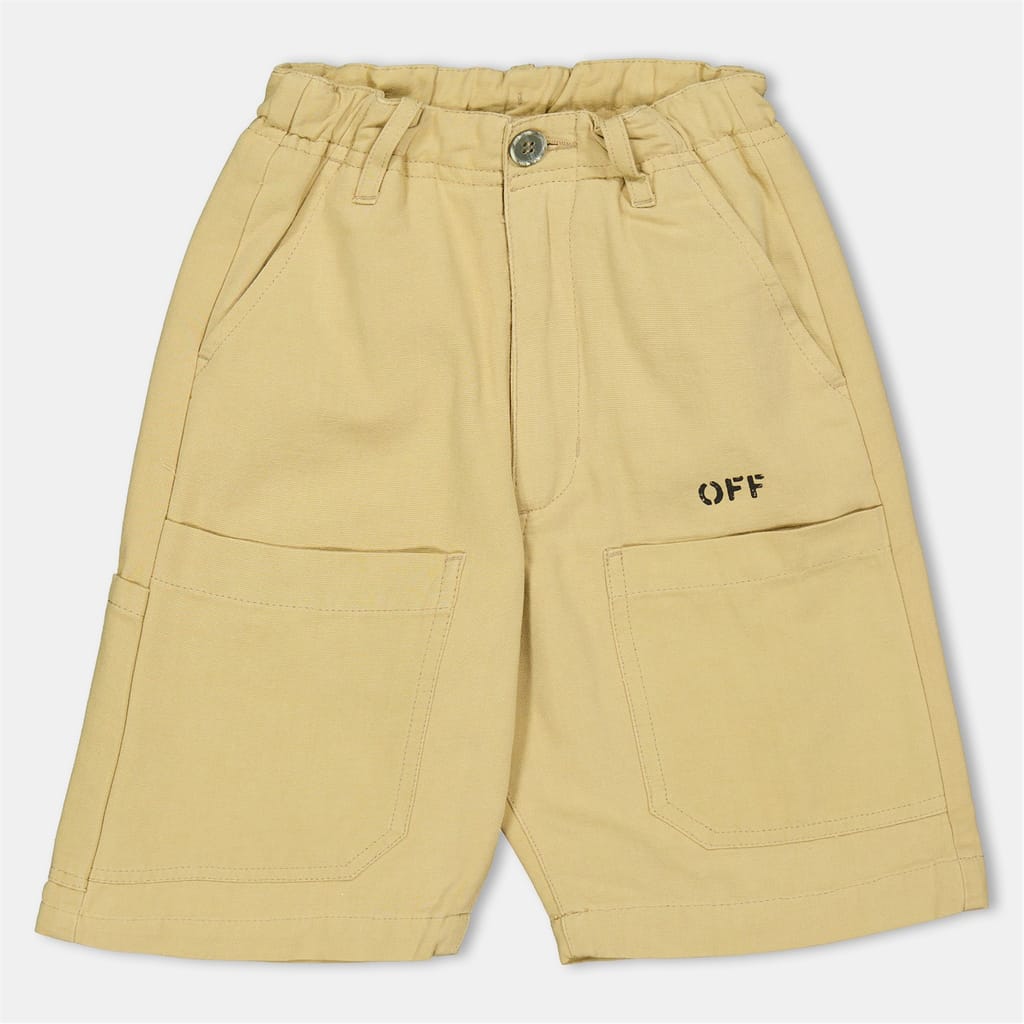These Off-White bermuda shorts are a stylish addition to your casual collection. Featuring a solid pattern, they come with a button closure and an elasticated waistband for comfort. The shorts are embellished with pockets and a distinctive logo, complemented by lettering graphics for a modern touch. -