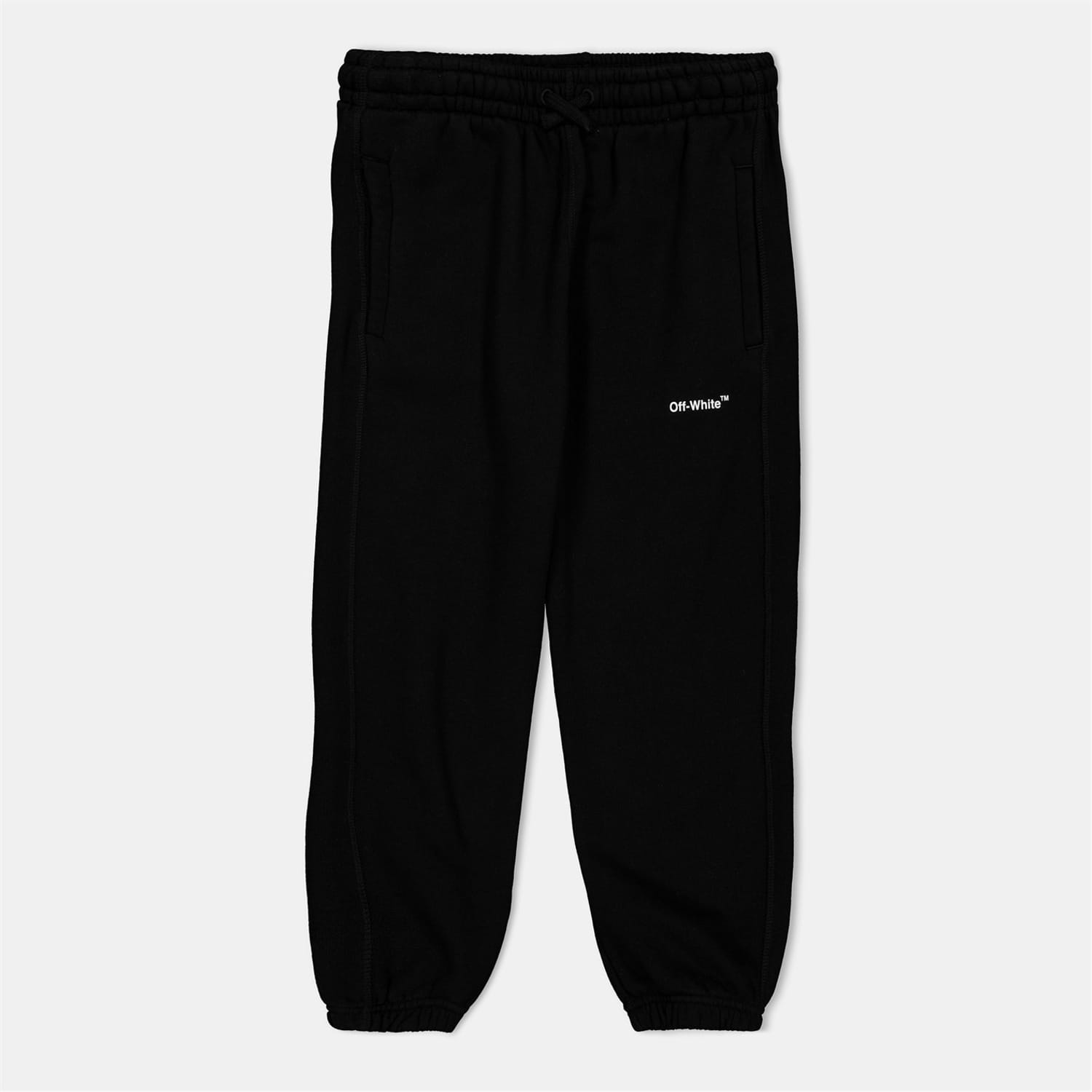 Off White joggers feature a drawstring closure and a cuffed leg design. These joggers are adorned with a logo embellishment, adding a distinctive touch to the casual style. -