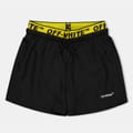 Off White swimwear swim bottom is designed for swimming enthusiasts. Featuring a drawstring closure for a secure fit, it is adorned with a distinctive logo embellishment, adding a touch of style to your swimwear collection. -