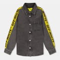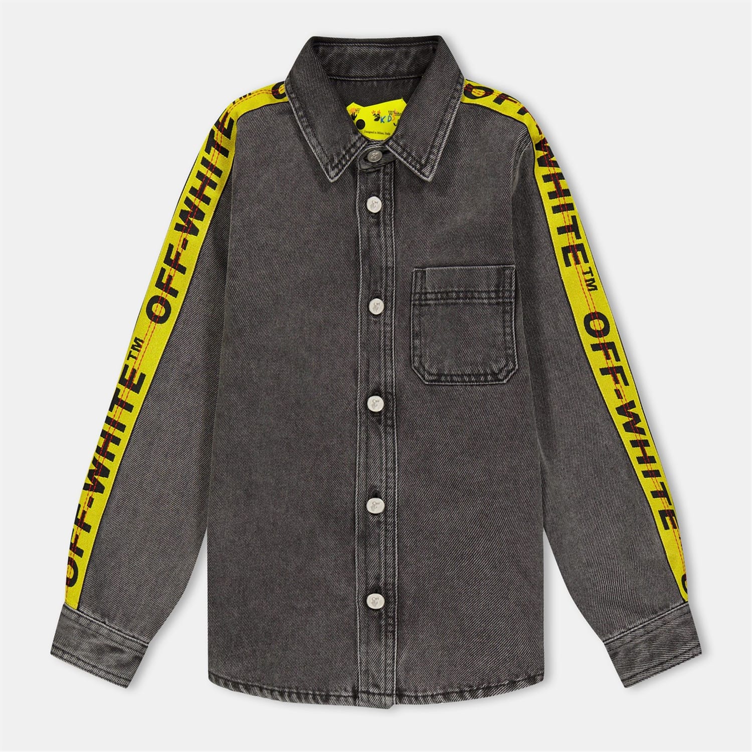 This Off White top features a solid pattern with a shirt collar and long sleeves. The regular fit ensures comfort, while the button closure adds a classic touch. Embellished with distinctive lettering, this piece showcases the brand's logo, making it a stylish addition to any wardrobe. -