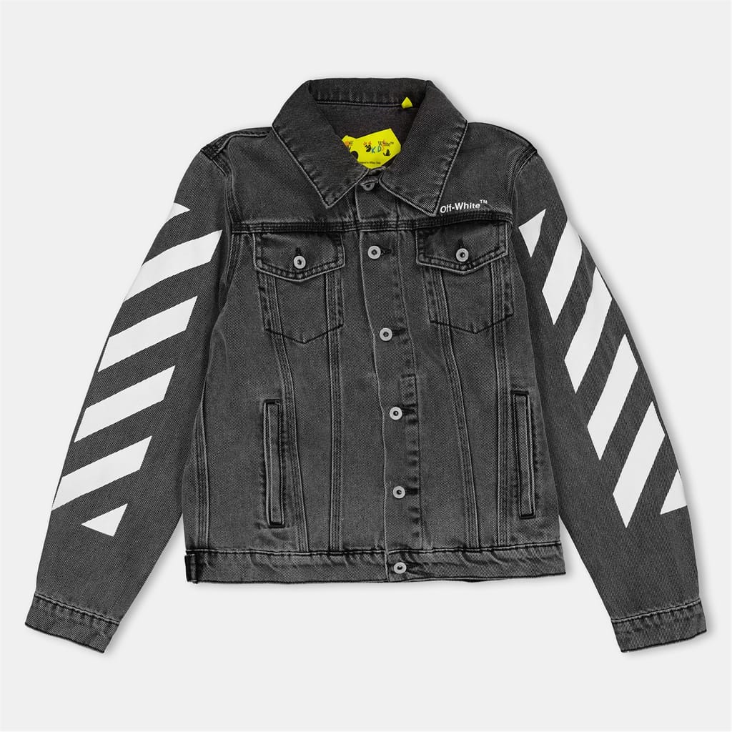 This Off-White denim jacket features a classic shirt collar and a button closure. Designed with a regular fit, it has a short length and a straight hem. The jacket is adorned with a logo and a stripe pattern, adding a distinctive touch to its design. -