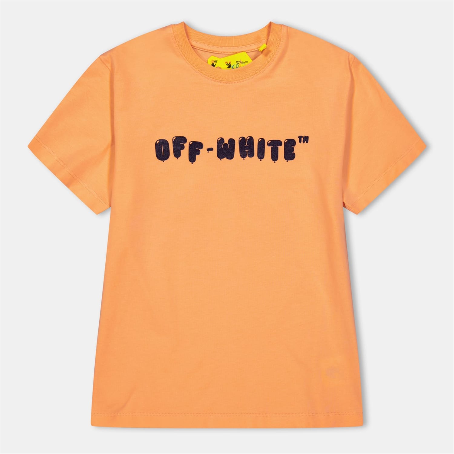This Off White top features a regular fit with a crew neck and short sleeves. The casual piece is adorned with a graphic print and lettering, highlighted by the brand's logo embellishment. Perfect for adding a touch of style to your everyday wardrobe. -