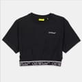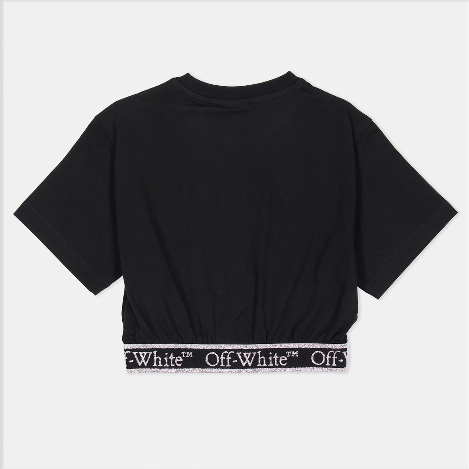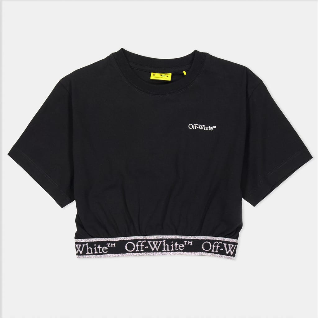 This Off White cropped top features a crew neck and short sleeves, offering a regular fit. The solid pattern is complemented by a logo embellishment, adding a distinctive touch to this stylish piece. -