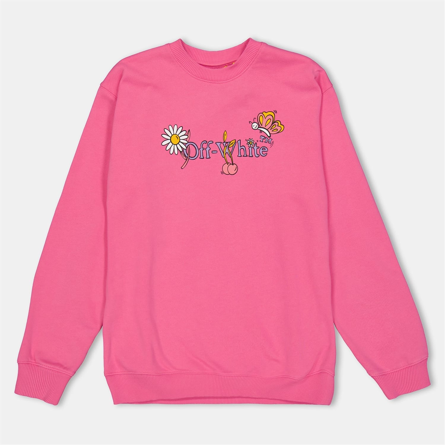This Off White top features a long sleeve design with ribbed cuffs for a comfortable fit. The crew neck adds a classic touch, while the graphic print and embroidered floral embellishments provide a stylish flair. The logo detail enhances its distinctive appeal, making it a standout piece in any wardrobe. -