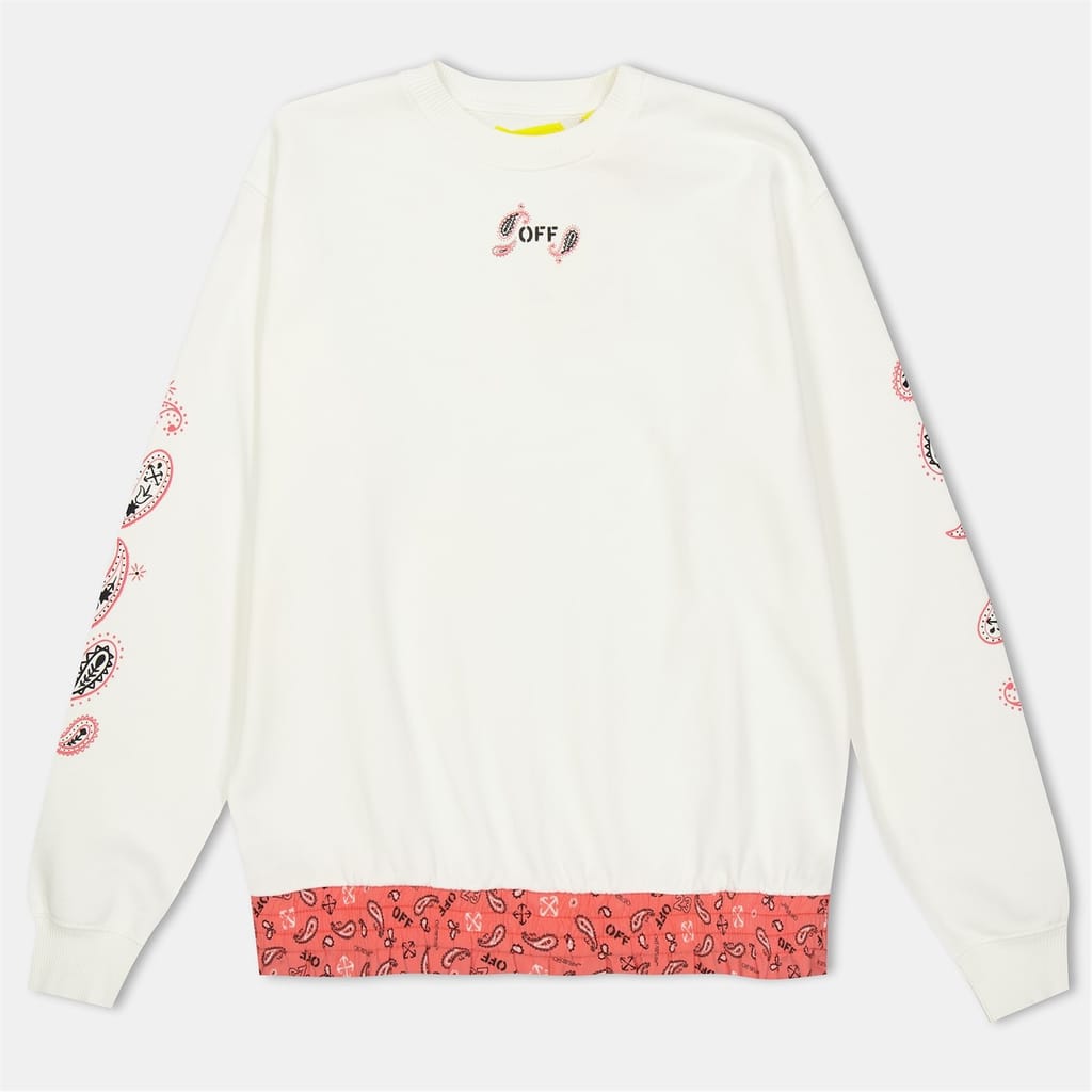 This Off White top features a crew neck and long sleeves, offering a regular fit. The bandana print adds a unique touch, while the ribbed collar and cuffs ensure comfort. A printed logo embellishment completes the design, making it a standout piece. -