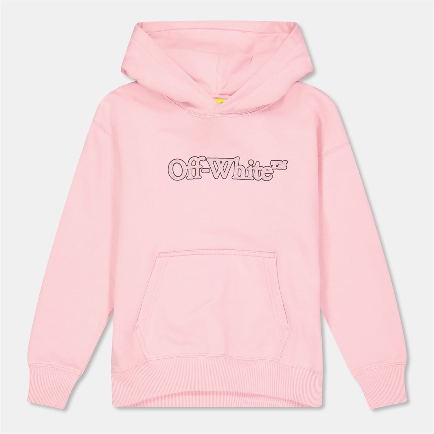 This Off White top features a hooded neck and long sleeves, offering a regular fit. The design includes a ribbed cuff and a kangaroo pocket, complemented by a graphic print with lettering. Suitable for all seasons, it showcases the brand's logo, adding a distinctive touch. -